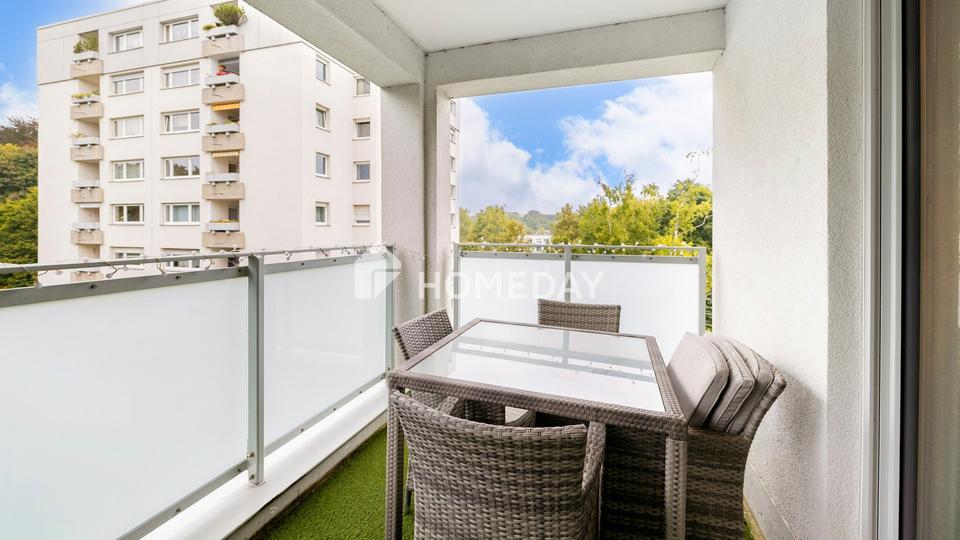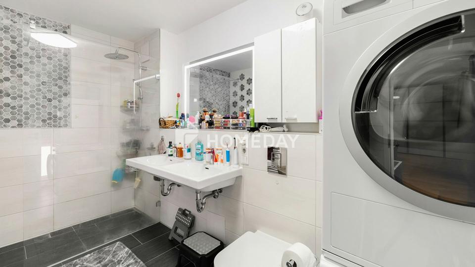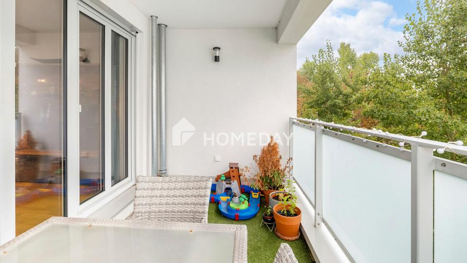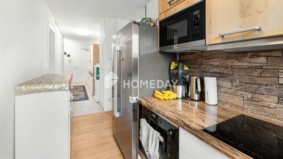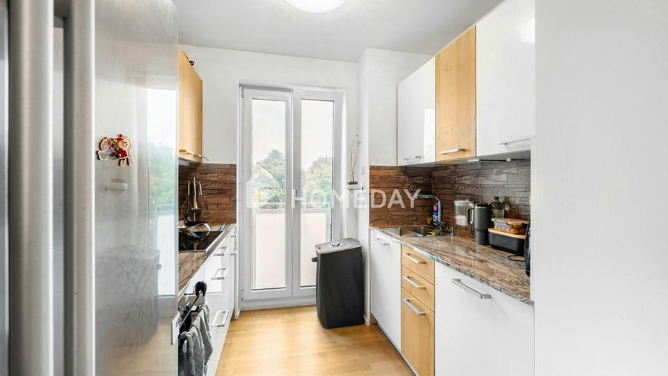 Der Mittelpunkt der Wohnung ist das großzügige, lichtdurchflutete Wohnzimmer mit direktem Zugang zur geschützten Loggia. Hier lässt sich der Blick ins Grüne genießen, während bodentiefe Fenster ein luftiges, freundliches Wohngefühl schaffen. Die angrenzende Küche ist modern ausgestattet und bietet alles, was man sich für den Alltag und das Kocherlebnis wünscht.