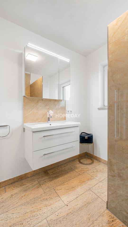 Das Obergeschoss beherbergt vier Schlafzimmer, die sich ideal als Eltern-, Kinder- oder Gästezimmer nutzen lassen. Zwei geschmackvoll ausgestattete Badezimmer, eines davon mit bodengleicher Dusche, das andere mit Badewanne, bieten höchsten Wohnkomfort für die ganze Familie. Die Fenster in allen Räumen sind in wärmedämmende Kunststoffrahmen gefasst, doppelt verglast und mit Rollläden versehen.