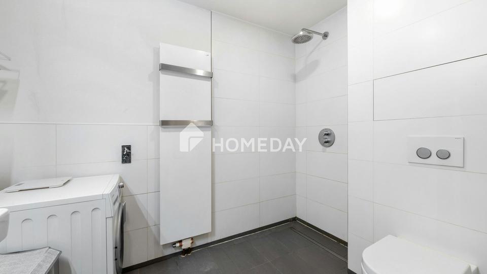 Das Badezimmer präsentiert sich stilvoll und modern: Eine ebenerdige Regendusche sowie ein Waschmaschinenanschluss unterstreichen den gehobenen Ausstattungsstandard. Das halbe Zimmer bietet zusätzliche Nutzungsmöglichkeiten – etwa als Schlafbereich, Arbeitsnische oder Ankleidezimmer – und schafft so ein flexibles Raumangebot.