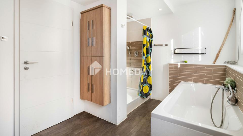 Hier befindet sich ein Duschbad im Erdgeschoss und ein großzügiges Tageslichtbad samt Regendusche und Badewanne im Obergeschoss.