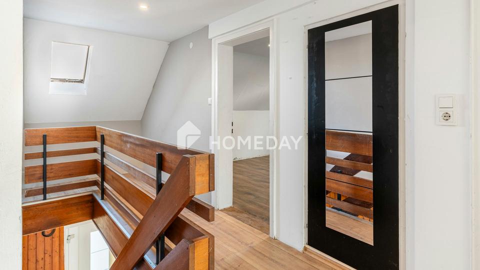 Die Galerie verleiht dem Wohnzimmer im Obergeschoss ein großzügiges Raumgefühl und zugleich zusätzliche Wohnfläche im Dachgeschoss. Das Haupthaus wurde bereits renoviert, jedoch nicht vollständig.