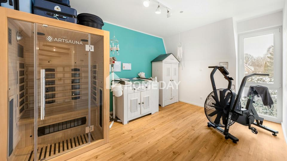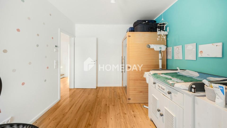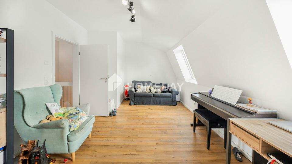Das Obergeschoss ist ganz auf Rückzug und Wellness eingestellt. Das Elternschlafzimmer mit seiner begehbaren Ankleide ist ein privater Rückzugsort der Extraklasse. Das stylische Hauptbad wird zur Familien-Wellness-Oase und besticht durch eine moderne, ebenerdige Dusche. Ein geräumiges Kinderzimmer bietet Platz zum Wachsen und Spielen, während der separate Hauswirtschaftsraum auf dieser Ebene die täglichen Wege angenehm verkürzt. Doch das eigentliche Highlight wartet unter dem Dach: Dank der steilen Dachneigung sind die Schrägen hier kaum wahrnehmbar und wirken eher wie ein gestalterisches Element. Der vollständig erschlossene Dachboden beherbergt ein weiteres großes Zimmer sowie einen idealen Büro- oder Hobbyraum – perfekt für Homeoffice oder ein zweites Kinderparadies.