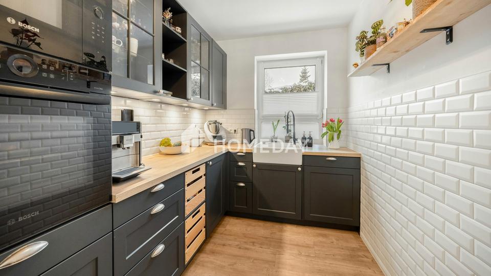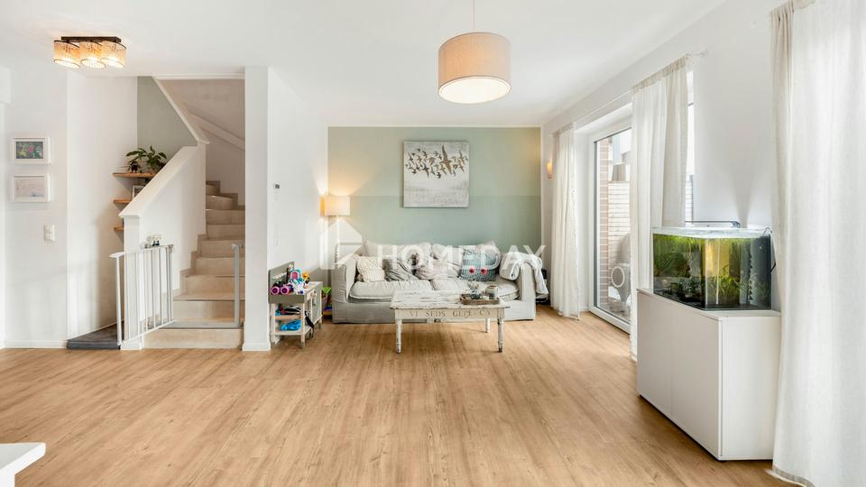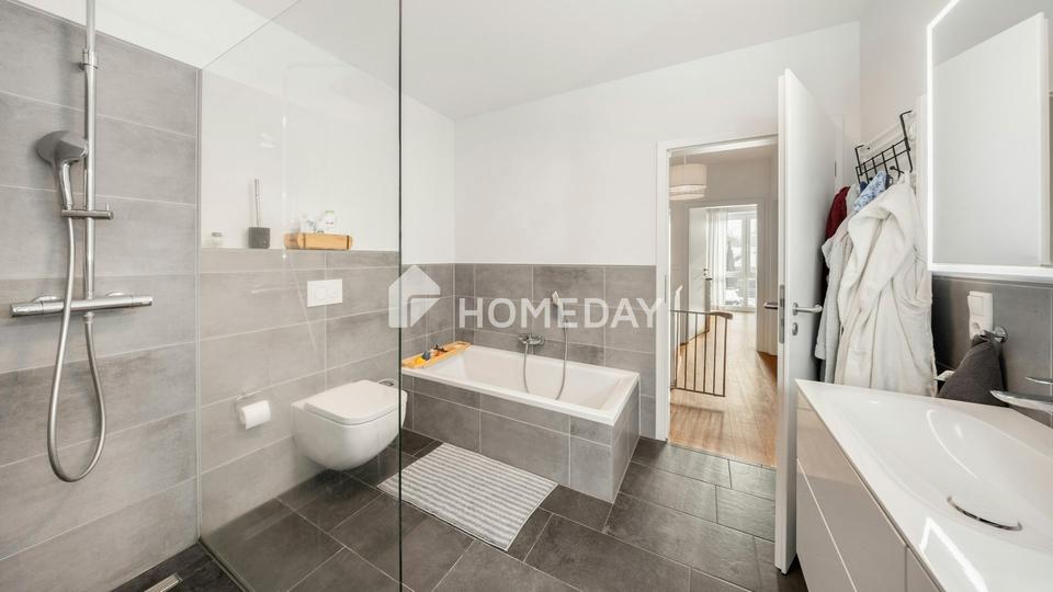 Das Herzstück im Erdgeschoss ist der großzügige Wohn- und Essbereich, der nahtlos in die offene Traumküche übergeht. Die stilvolle Top-Marken-Küche in elegantem Schwarz bildet einen faszinierenden Kontrast zu den klassischen weißen Fliesen und lädt zu gemeinsamen Kochabenden ein. Von hier aus erweitert sich Ihr Lebensraum direkt auf die Terrasse und in den kleinen, pflegeleichten Garten – Ihre private Oase für entspannte Stunden im Freien, ohne dass die Gartenarbeit das ganze Wochenende beansprucht. Ein praktisches Gäste-WC in neuwertigem Design sowie ein großer Technik- und Abstellraum ergänzen das Erdgeschoss perfekt und bieten den nötigen Stauraum für das Familienleben.