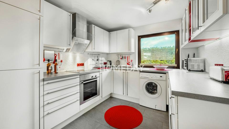 Die Küche ist funktional gehalten und fügt sich unaufgeregt in das Gesamtbild ein. Fliesen als überwiegender Bodenbelag passen ideal zu einem Haus in Meernähe. Kunststofffenster mit Doppelverglasung und Wärmeisolierung sorgen für ein angenehmes Raumklima – zu jeder Jahreszeit.