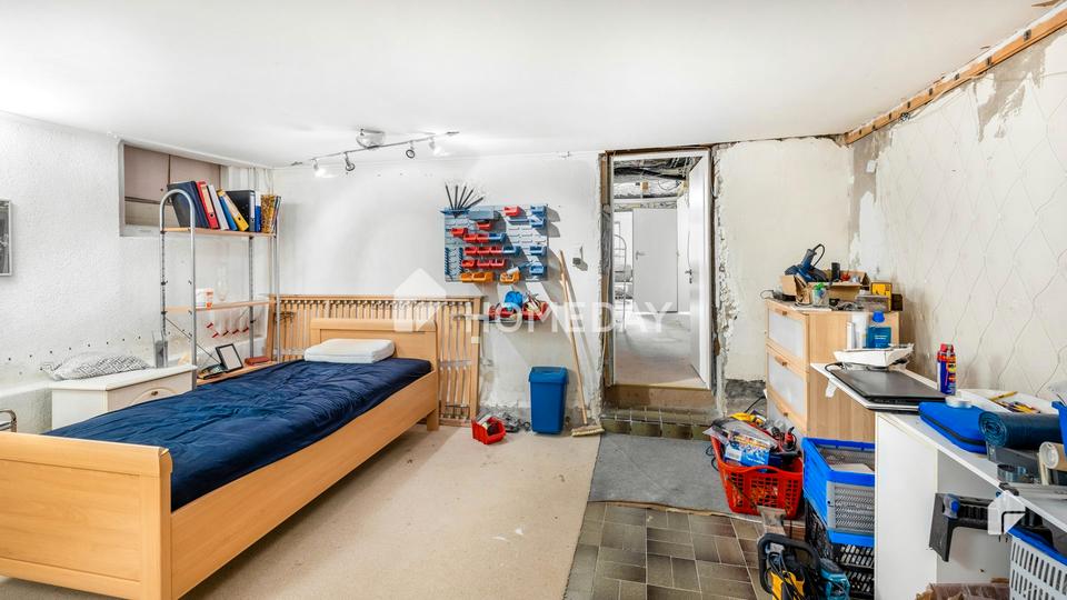 Im ausgebauten sowie beheizten Kellergeschoss mit angenehmer Stehhöhe finden Sie drei weitere Schlafzimmer, von denen das große, ehemals als Elternschlafzimmer genutzte, ebenfalls die für die Immobilie charakteristische, charmante Rundung aufweist. Ein weiterer Raum, der sich als Badezimmer eignet, sowie zwei geräumige Abstellräume sind ebenfalls zu finden.