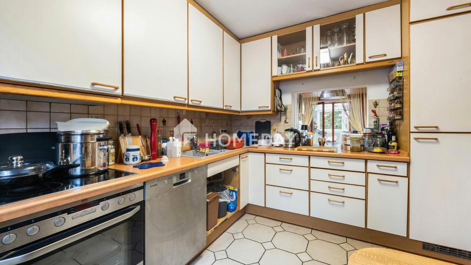 Die Wohnfläche verteilt sich auf circa 133 Quadratmeter, das Grundstück umfasst circa 323 Quadratmeter. Parkett und Fliesen als Bodenbeläge bieten eine solide Basis. Viele Elemente stammen noch aus dem Baujahr 1988 oder aus der Zeit der Fenstersanierung im Jahr 2001.