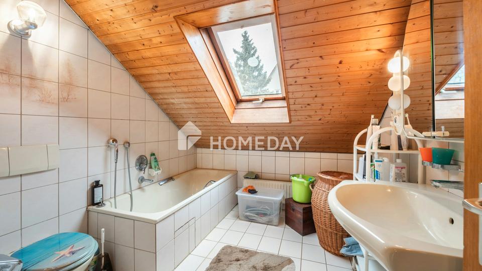Über das Treppenhaus gelangen Sie in das Dachgeschoss, das klassische Rückzugsräume bietet. Hier befinden sich ein Schlafzimmer mit ruhiger Ausrichtung, ein Kinderzimmer und ein weiteres Zimmer, das sich sehr gut als Gästezimmer oder zusätzlicher Raum für ein größeres Kind eignet. Ein Badezimmer mit Badewanne, Bidet und Fenster ist auf dieser Etage untergebracht. Wer sich eine moderne Optik wünscht, kann mit neuen Fliesen und Sanitärobjekten relativ klar planen, da der Grundriss sinnvoll angelegt ist.