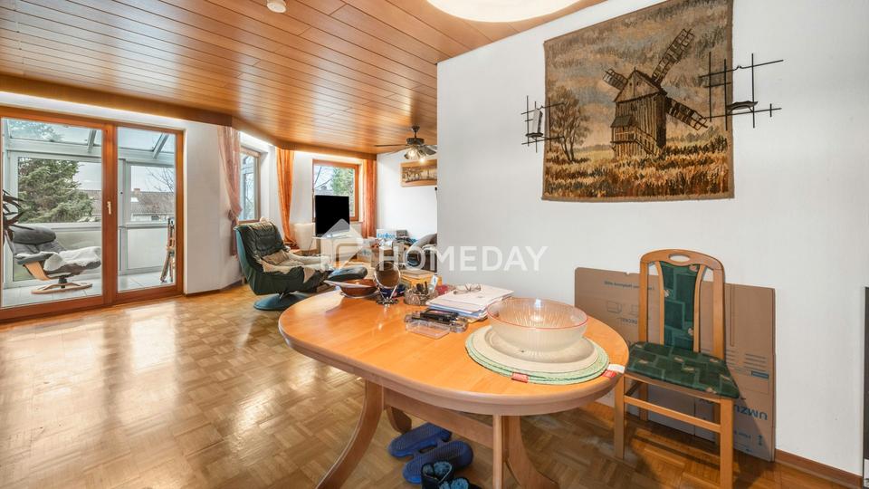 Im Erdgeschoss betreten Sie das Haus über einen klassischen Flurbereich, der Platz für Garderobe und Alltagsschuhe bietet. Von hier erreichen Sie die separate Küche, die Sie nach einer Modernisierung wunderbar als Mittelpunkt für den Familienalltag nutzen können. Das angrenzende Esszimmer schafft eine klare Zonierung zwischen Kochen und gemeinsamer Zeit. Der eigentliche Wohnbereich ist großzügig geschnitten, mit Parkett ausgestattet und wirkt durch den direkten Zugang in den Wintergarten besonders offen.