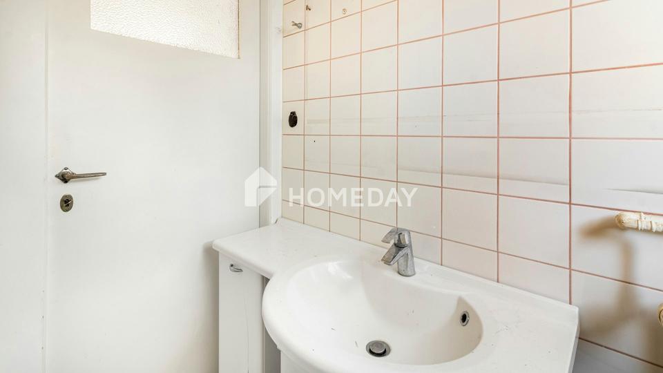 Im Inneren präsentiert sich die Immobilie mit einer soliden, funktionalen Ausstattung. Hervorzuheben sind die zwei Bäder: Das Bad im Erdgeschoss ist mit einer Badewanne ausgestattet und verfügt über Tageslicht, während sich im Kellergeschoss ein innenliegendes Badezimmer mit Dusche befindet. Die Wohnräume sind mit Fliesen und Linoleum ausgelegt und unterstreichen den praktischen Charakter der Immobilie.