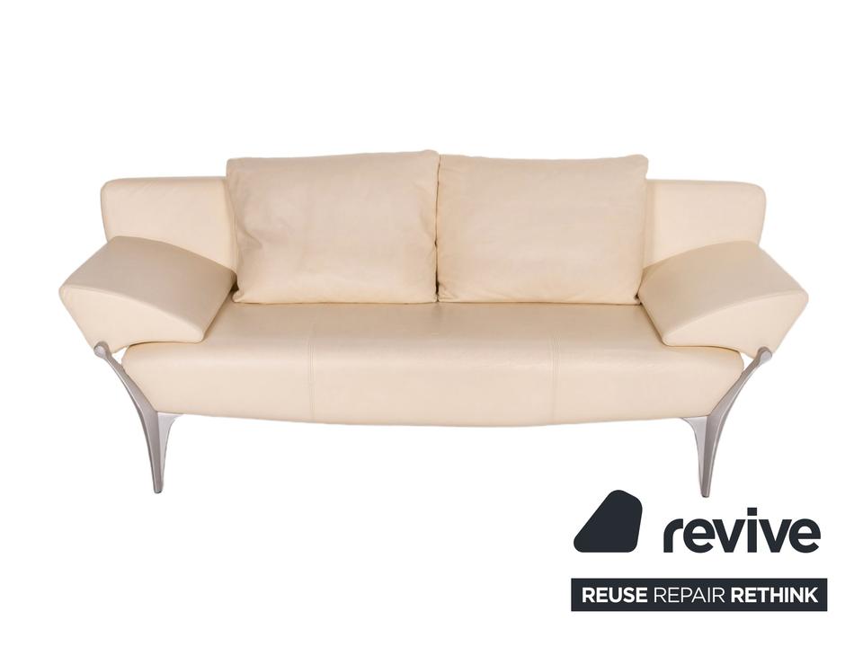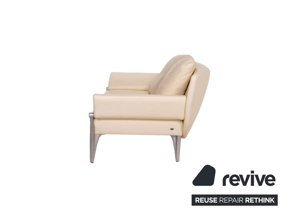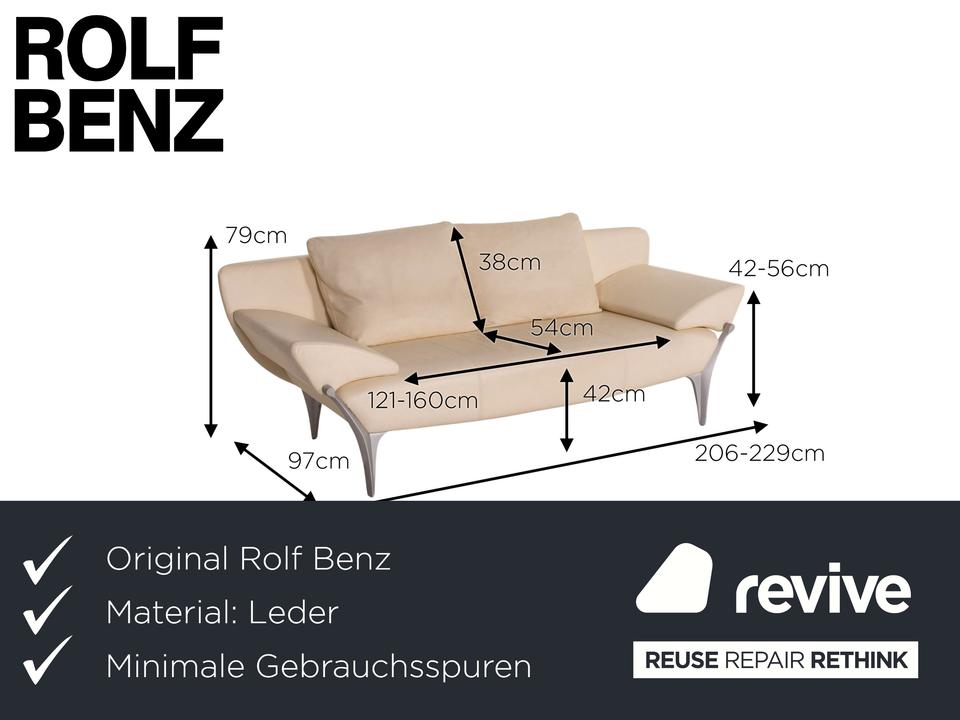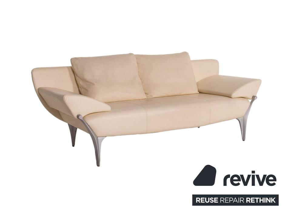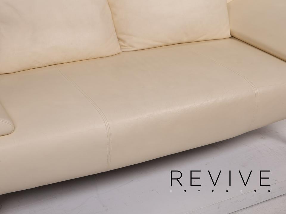Das Modell 1600 von Rolf Benz ist mit einem cremefarbenen Echtleder bezogen und steht auf dynamisch geformten, matten Metallfüßen. Das Sofa zeichnet sich besonders durch sein futuristisches Design aus. Die Armlehnen können nach unten geklappt werden, die Kissen sind von einem anderen Hersteller.