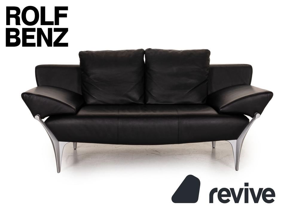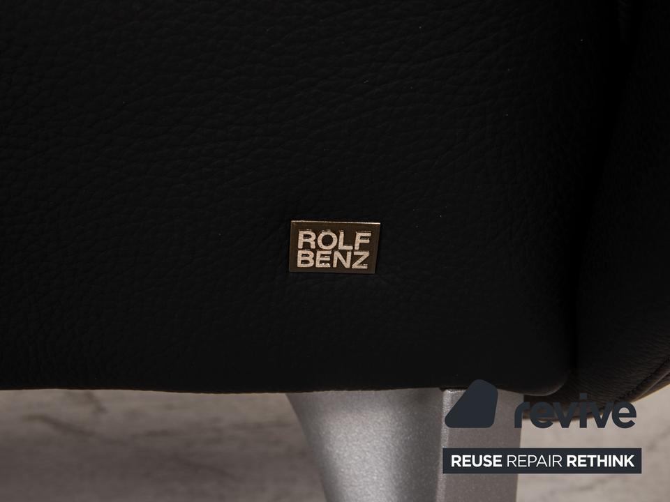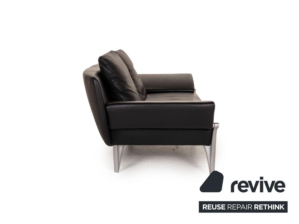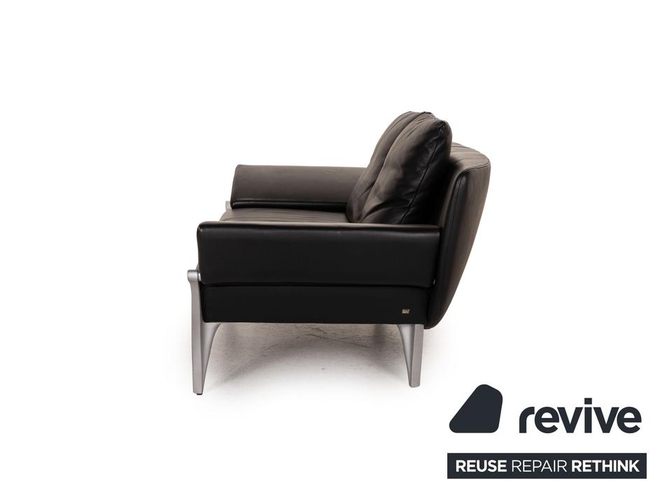 Der Zweisitzer 1600 von Rolf Benz ist mit einem schwarzen Echtleder bezogen und steht auf eleganten, silbernen Füßen. Seine Funktion, die Armlehnen für eine größere Sitzfläche umzuklappen und sein modernes Design, zeichnen ihn aus.