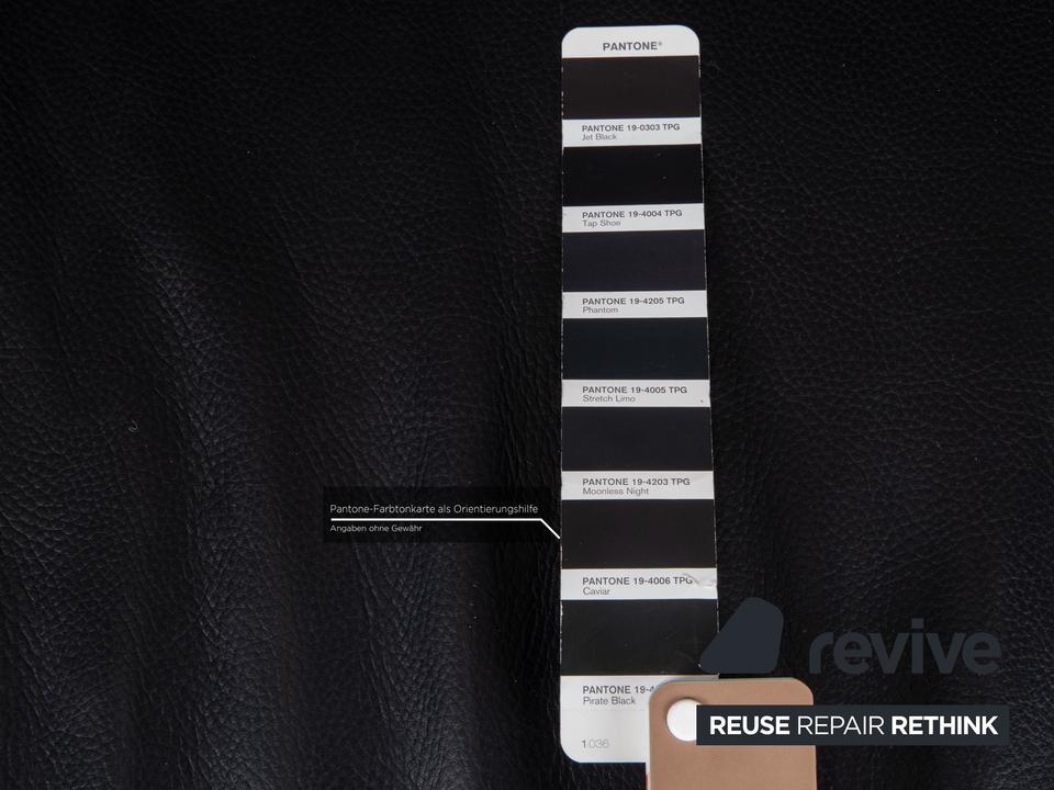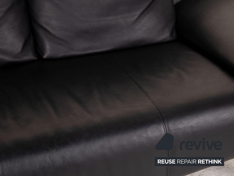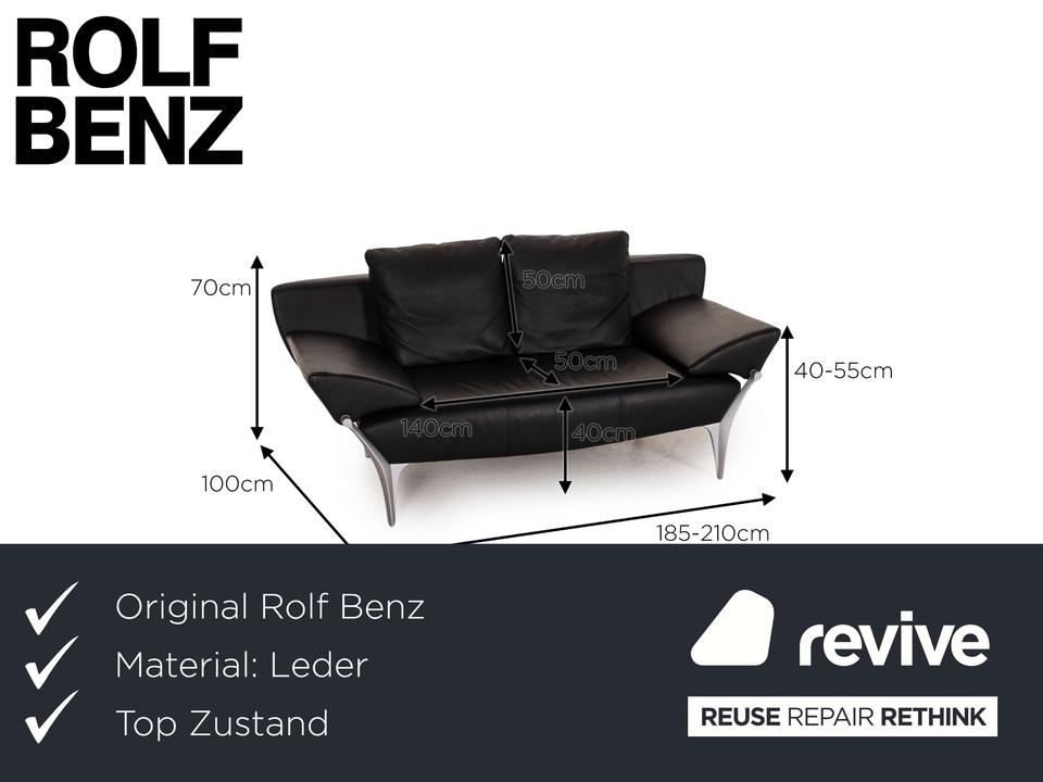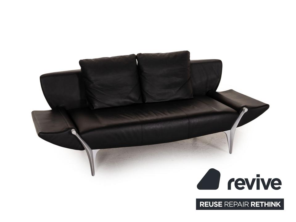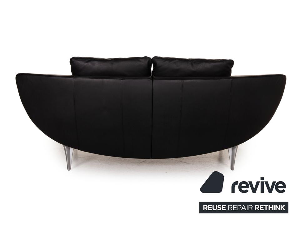 Der Zweisitzer 1600 von Rolf Benz ist mit einem schwarzen Echtleder bezogen und steht auf eleganten, silbernen Füßen. Seine Funktion, die Armlehnen für eine größere Sitzfläche umzuklappen und sein modernes Design, zeichnen ihn aus.
