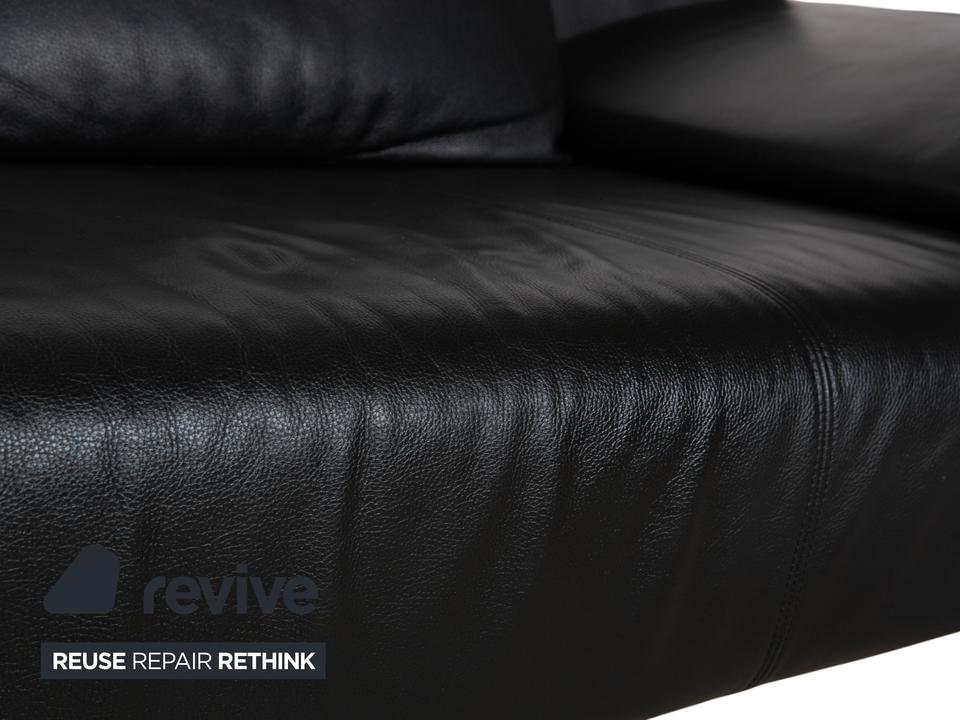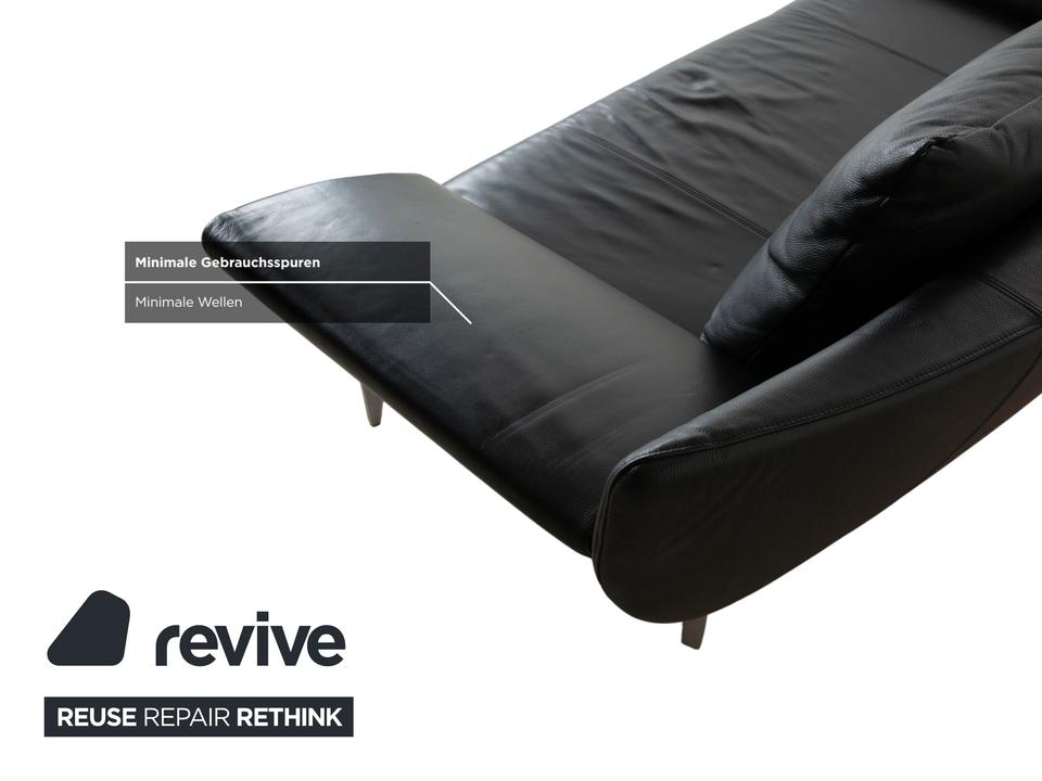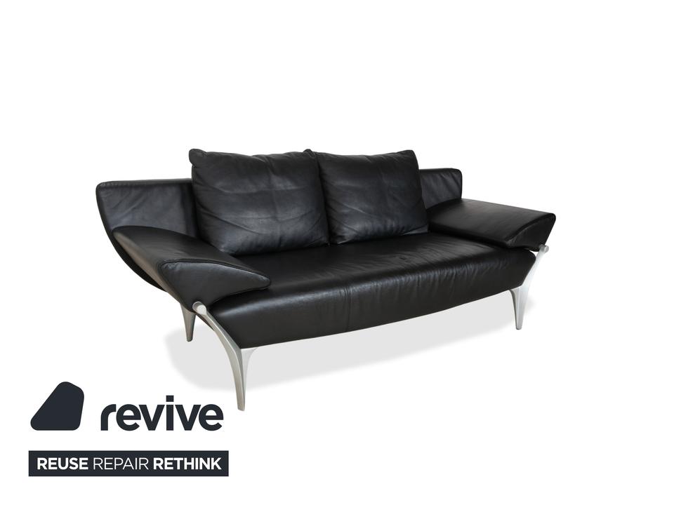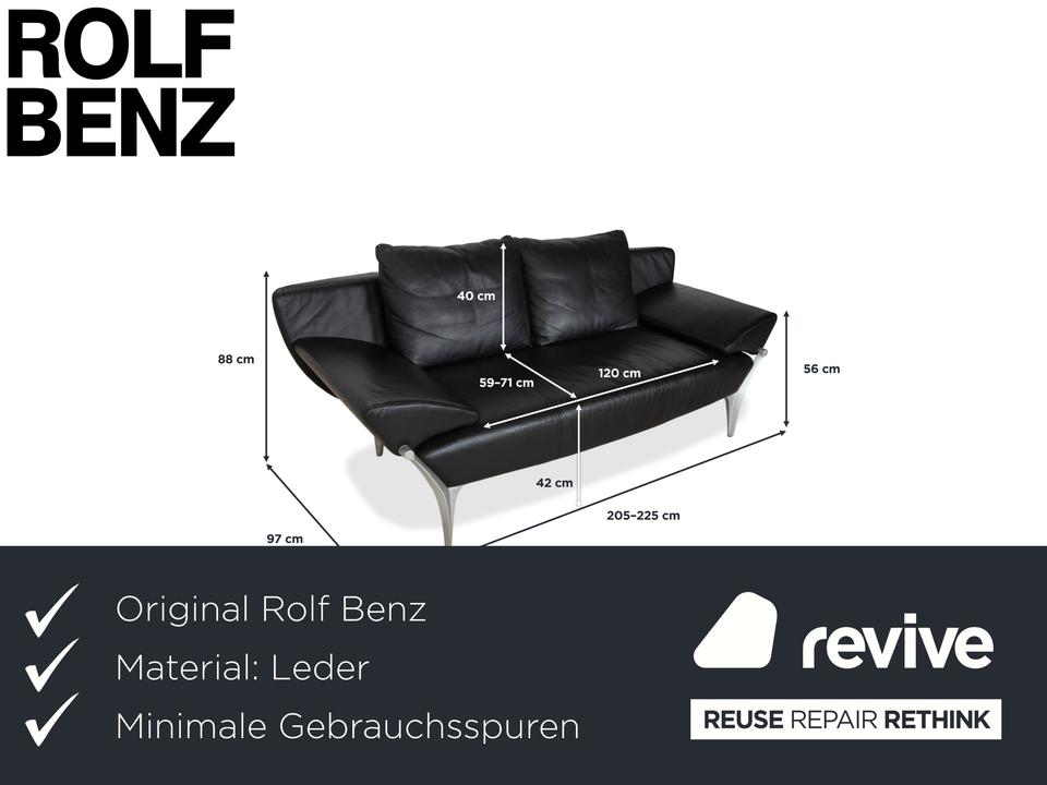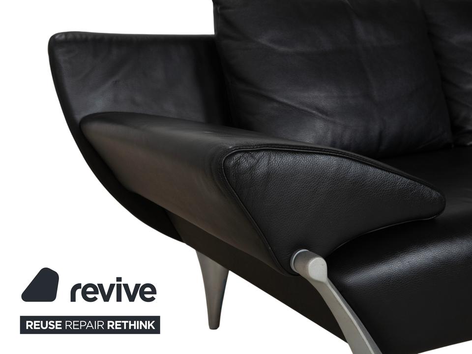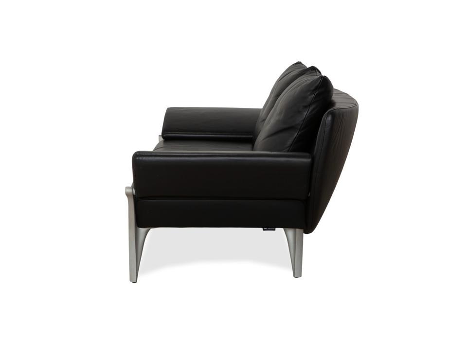 Rolf Benz 1600: Skulpturales Design mit CharakterDieses Sofa ist ein echter Design-Klassiker, der sich nicht verstecken muss. Das Modell 1600 von Rolf Benz ist bekannt für seine extravagante Formensprache, die Eleganz mit einer fast schon futuristischen Leichtigkeit verbindet.Der Zweisitzer ist in hochwertiges, schwarzes Leder gehüllt. Die Oberfläche zeigt einen edlen, sanften Glanz und wirkt durch die weiche Polsterung einladend und nicht kühl. Das auffälligste Merkmal ist die geschwungene Silhouette: Die Armlehnen sind nicht starr und gerade, sondern neigen sich wie Flügel elegant nach außen. Dies verleiht dem Sofa eine dynamische, offene Optik, die den Raum nicht blockiert, sondern bereichert.Für den typischen Rolf-Benz-Komfort sorgen die zwei großen, losen Rückenkissen. Sie wirken bewusst leger und „knautschig“, was sofortige Gemütlichkeit verspricht und den strengen Leder-Look aufbricht. Getragen wird das Kunstwerk von markanten Aluminium-Gussfüßen. Diese silbernen Beine sind organisch geschwungen – fast wie Stilettos – und laufen spitz zu. Sie heben den Korpus weit vom Boden ab und unterstreichen die schwebende Anmutung des Designs.