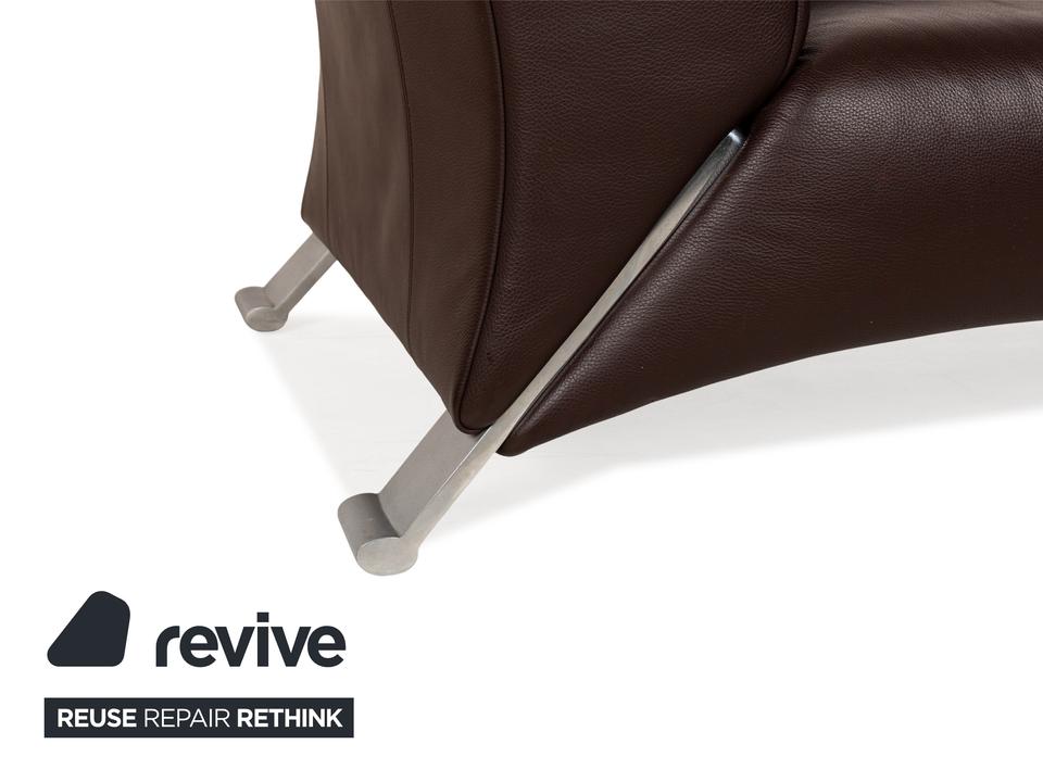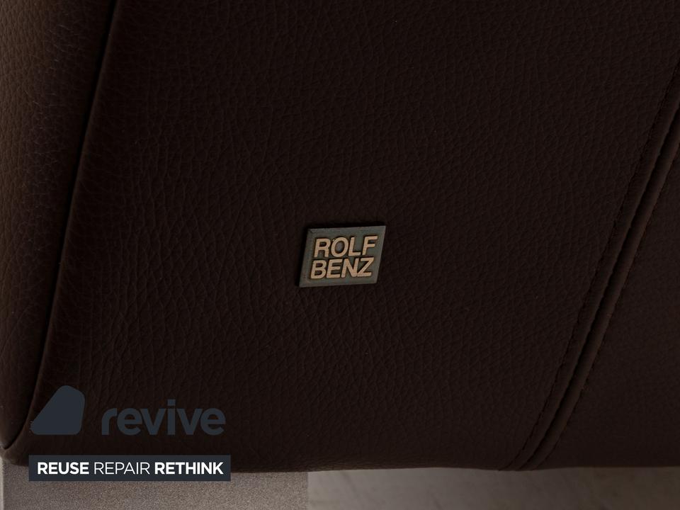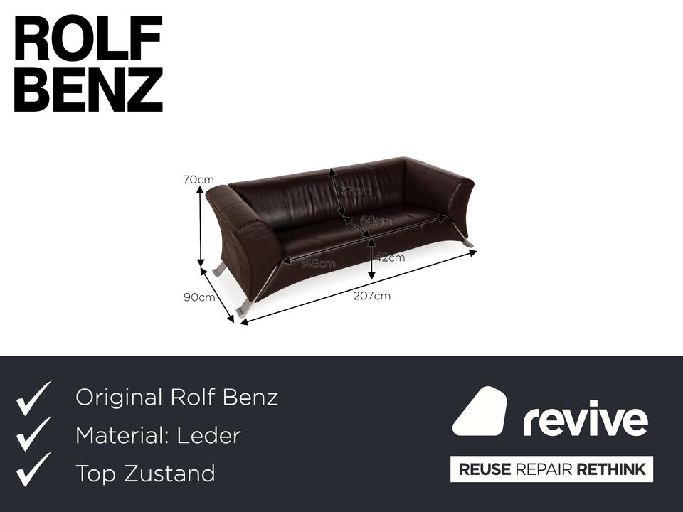 Das 322 Sofa von Rolf Benz ist mit einem braunen Leder bezogen und steht auf silbernen Metallfüßen. Das moderne Design und die abgerundeten Kanten zeichnen den Dreisitzer aus.