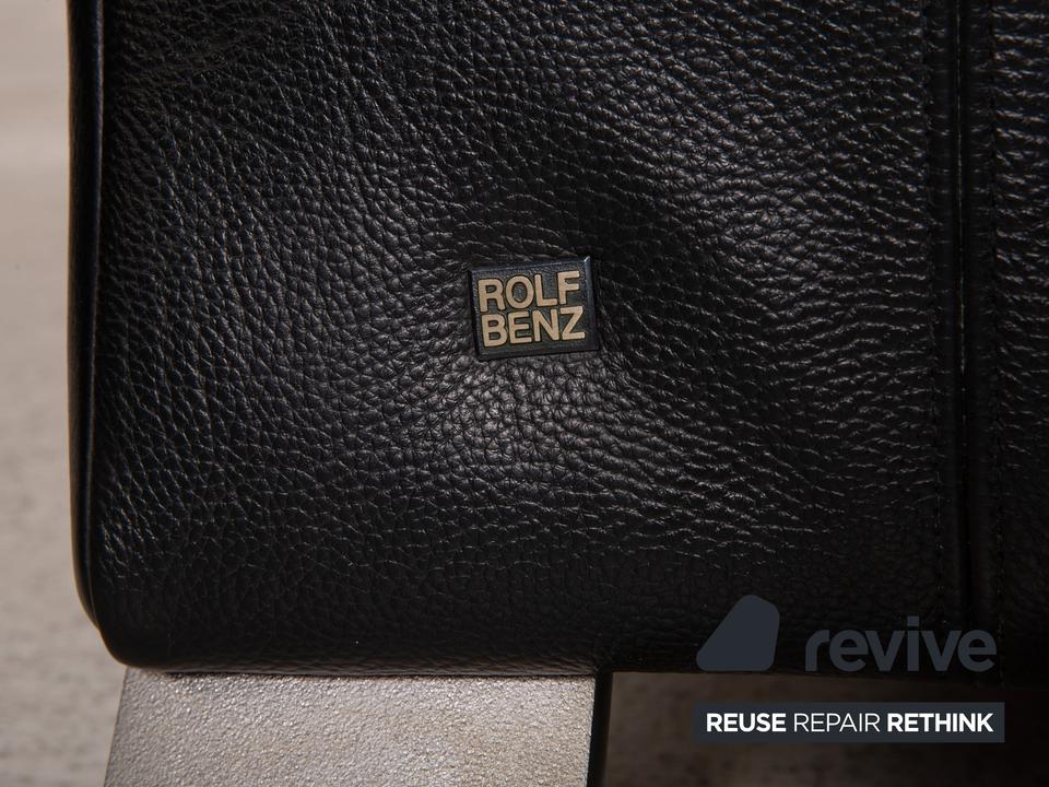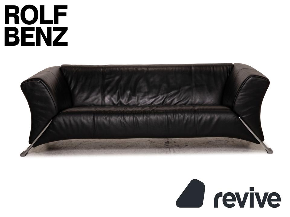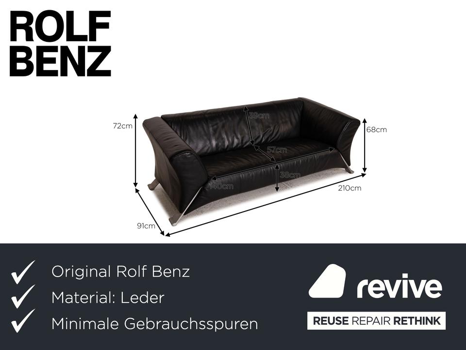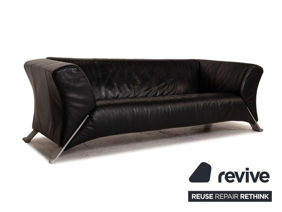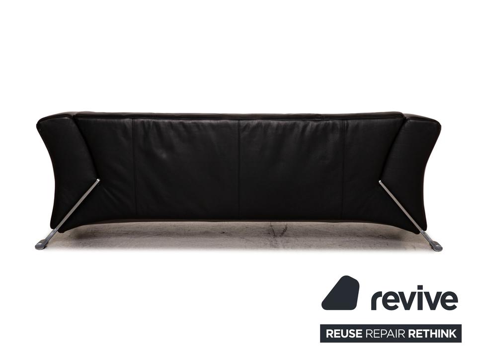Das 322 Sofa von Rolf Benz ist mit einem schwarzen Echtleder bezogen und steht auf silbernen Metallfüßen. Das moderne Design und die abgerundeten Kanten zeichnen den Dreisitzer aus.