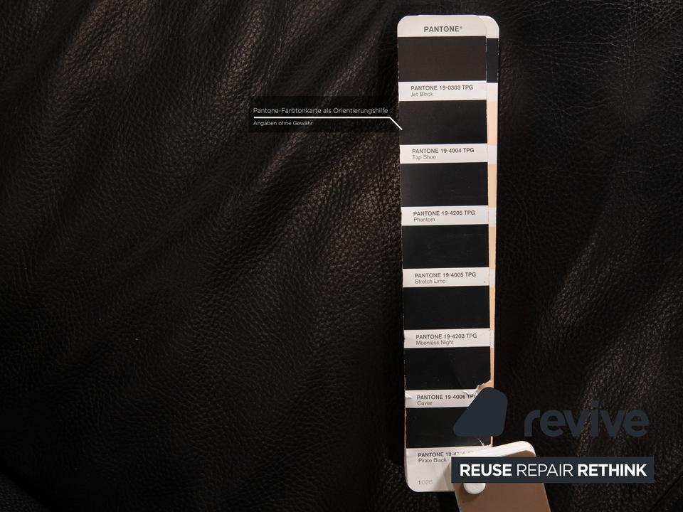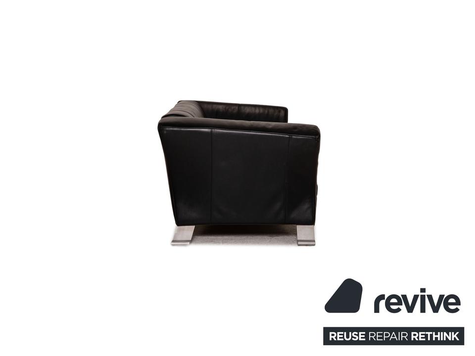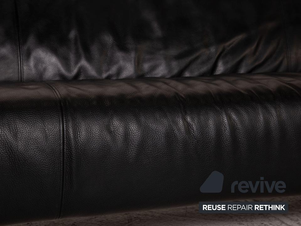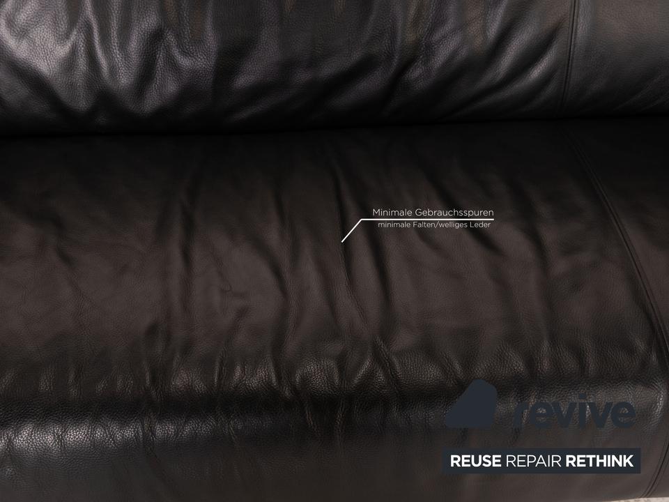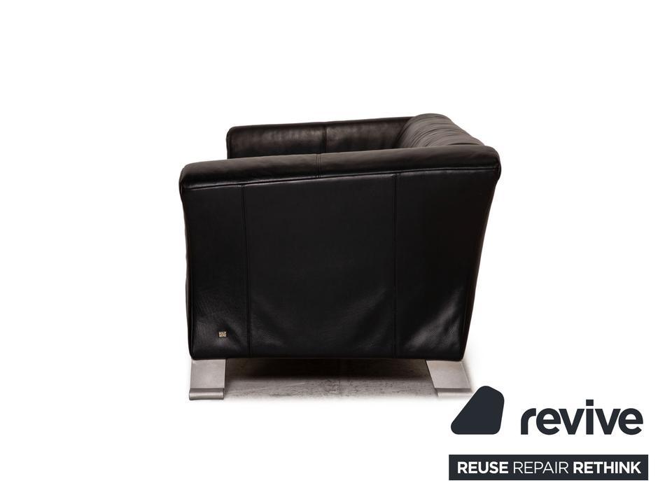 Das 322 Sofa von Rolf Benz ist mit einem schwarzen Echtleder bezogen und steht auf silbernen Metallfüßen. Das moderne Design und die abgerundeten Kanten zeichnen den Dreisitzer aus.