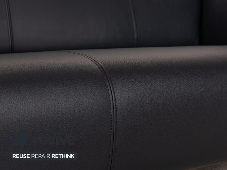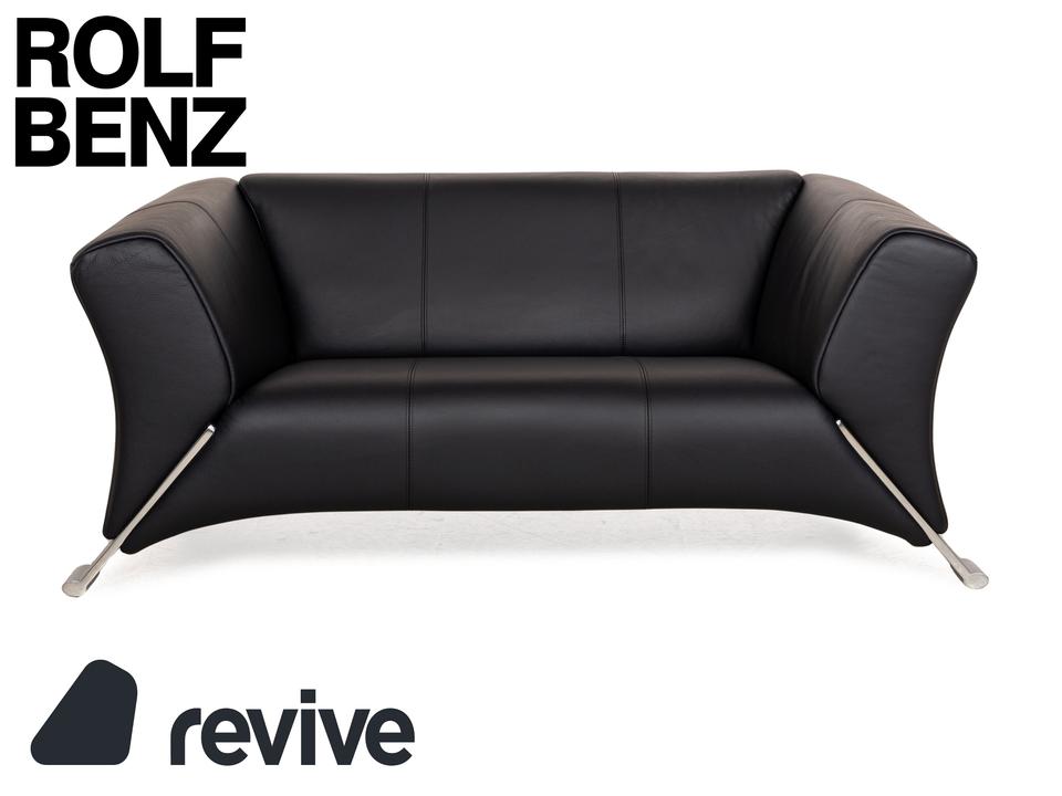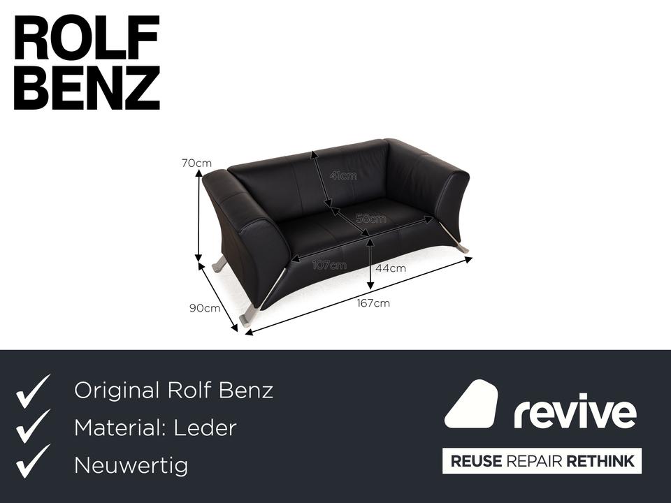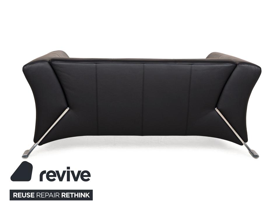 Das 322 Sofa von Rolf Benz ist mit einem dunkelblauen Echtleder bezogen und steht auf silbernen Metallfüßen. Das moderne Design und die abgerundeten Kanten zeichnen den Zweisitzer aus.