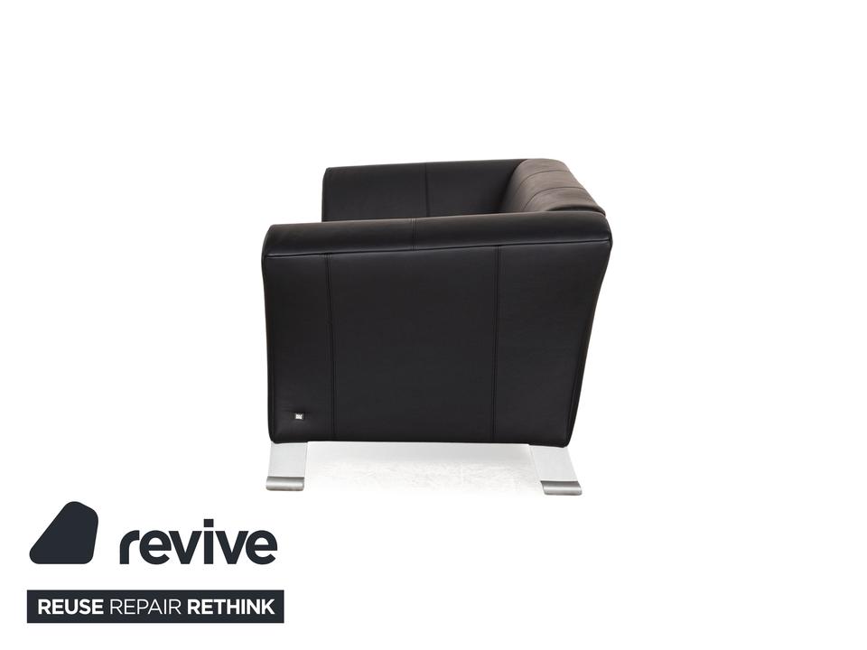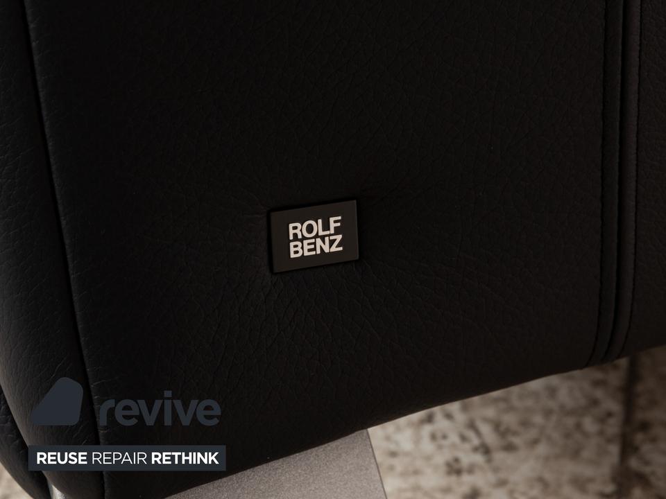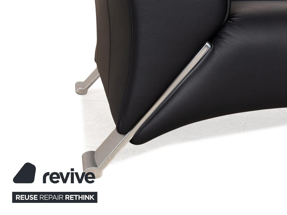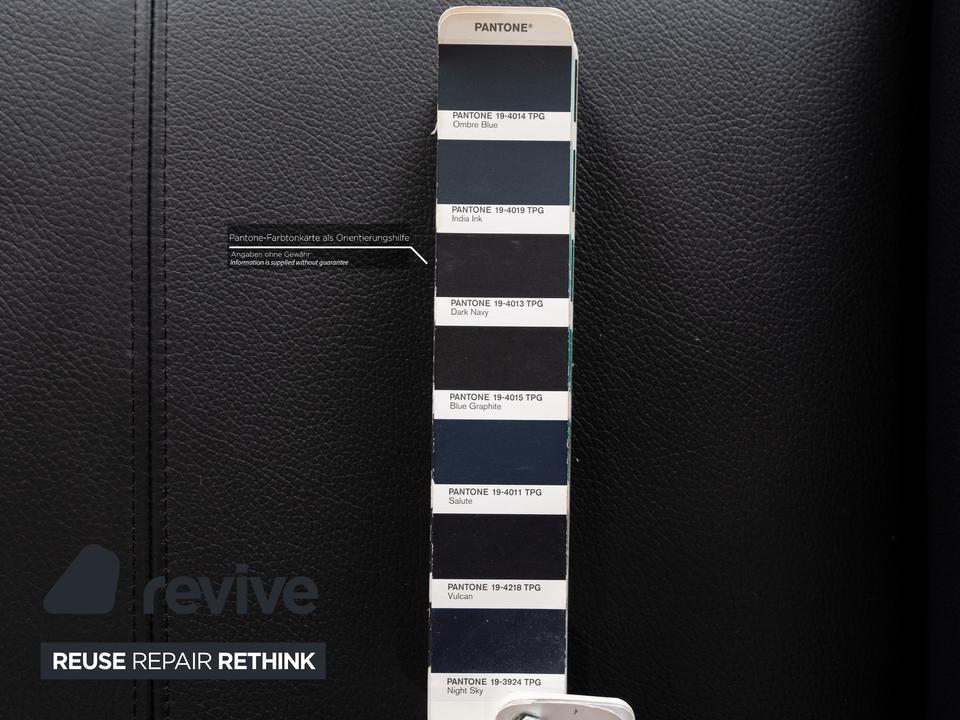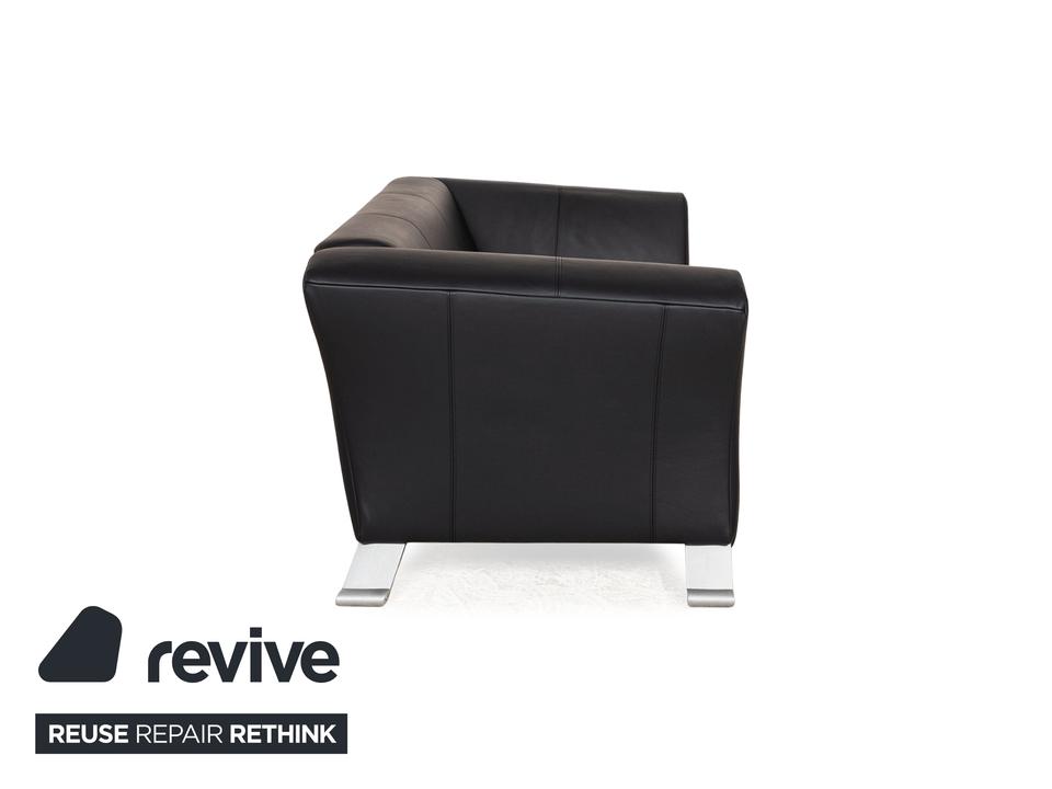 Das 322 Sofa von Rolf Benz ist mit einem dunkelblauen Echtleder bezogen und steht auf silbernen Metallfüßen. Das moderne Design und die abgerundeten Kanten zeichnen den Zweisitzer aus.