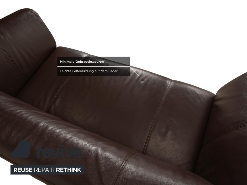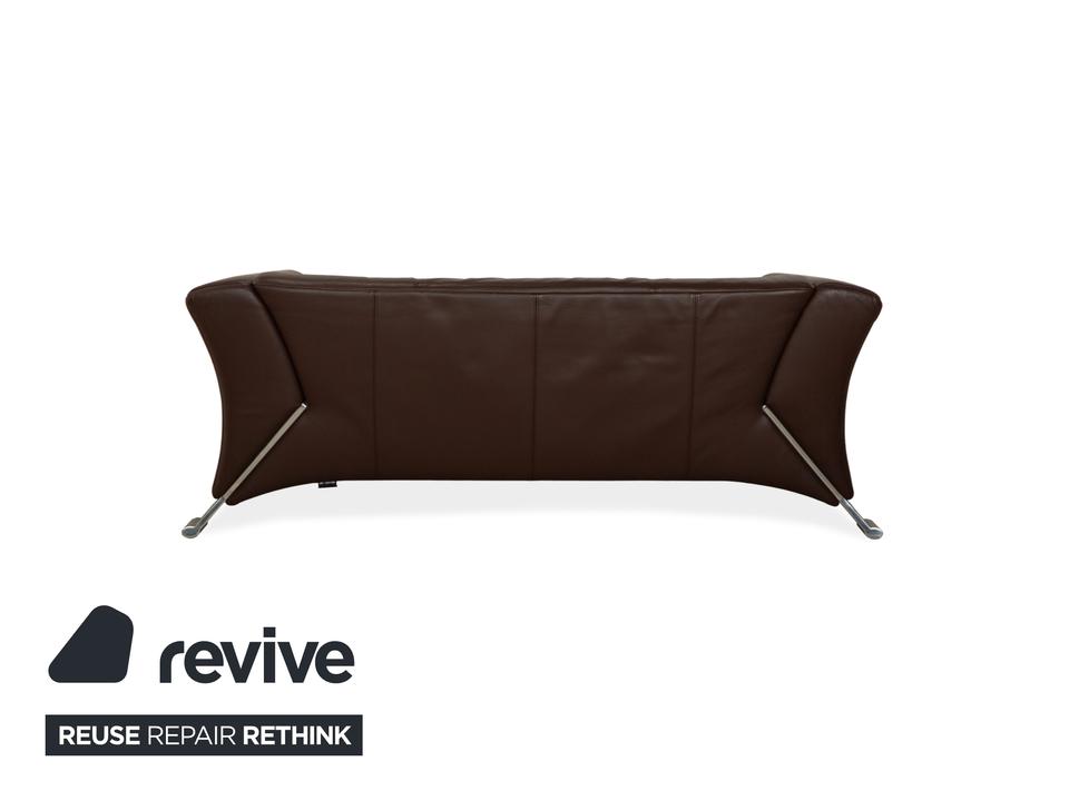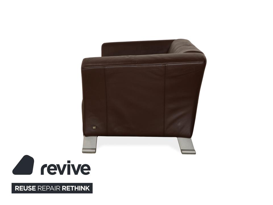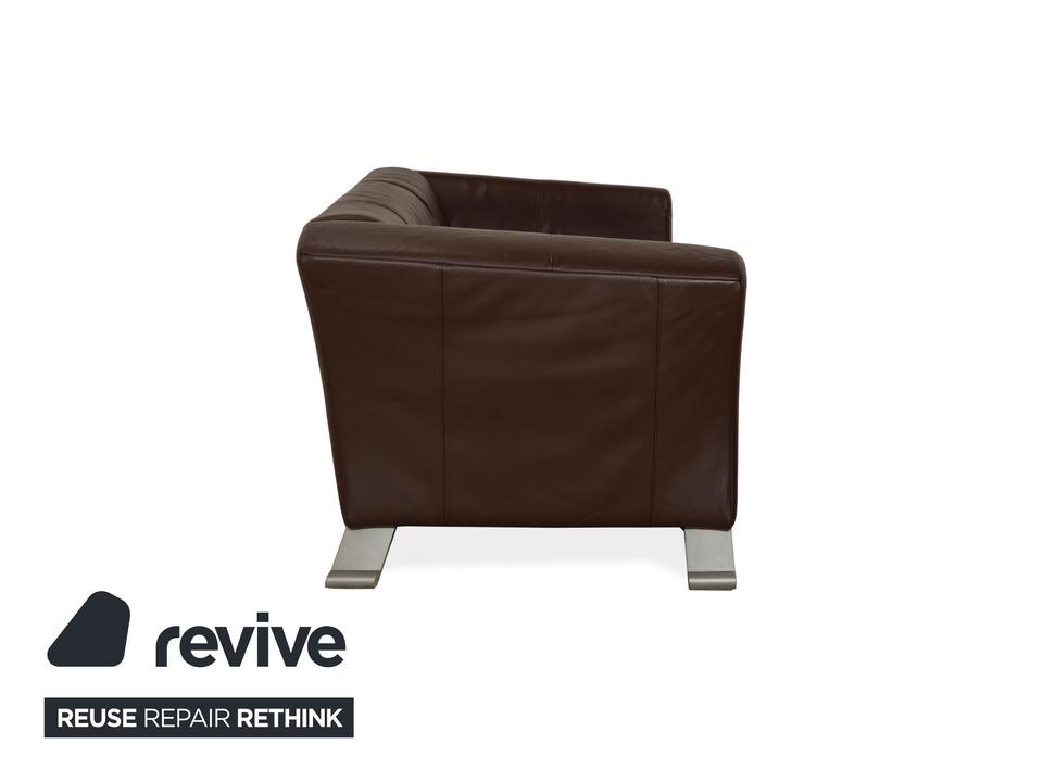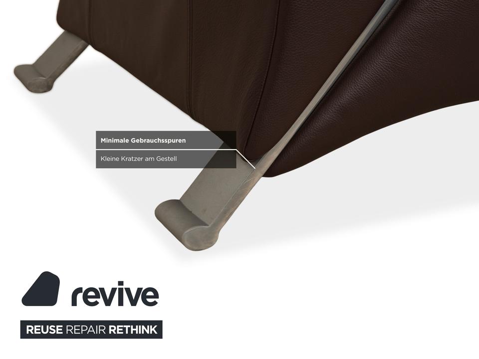 Das Sofa 322 von Rolf Benz ist mit einem modernen dunkelbraunen Leder bezogen und steht auf schräg vom Sofa wegführen Metallfüßen. Der Zweisitzer zeichnet sich durch sein reduziertes und leicht extravagantes Design aus: Rückenlehne und Armlehnen enden in fast gleicher Höhe, was den Fokus stärker auf die Gestaltung der Füße lenkt, die als fortgeführte Linie dem Sofa zu entwachsen scheinen.