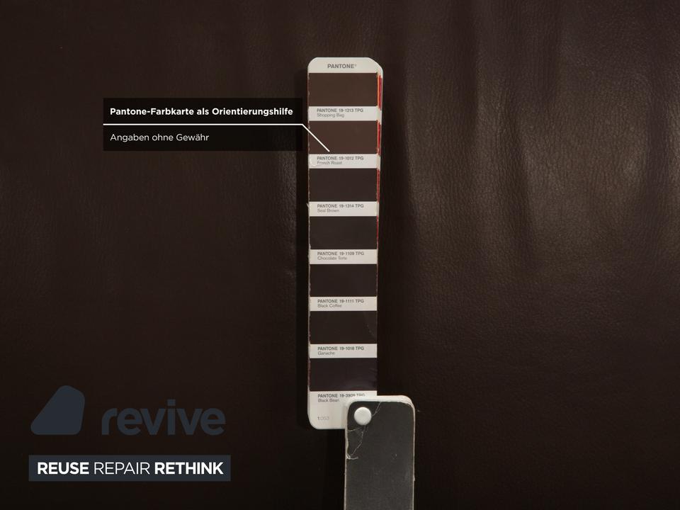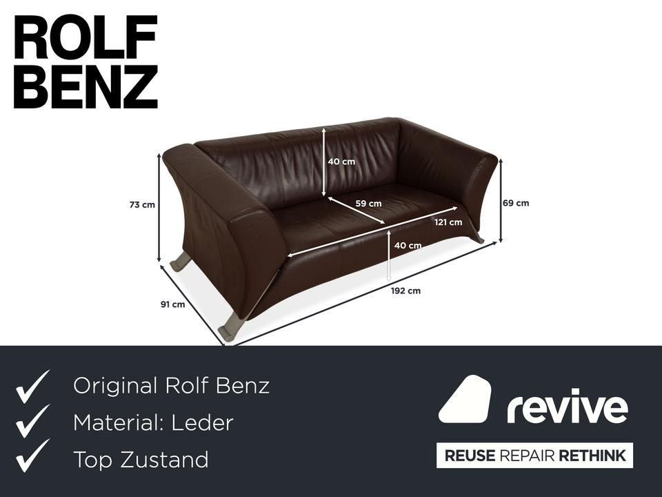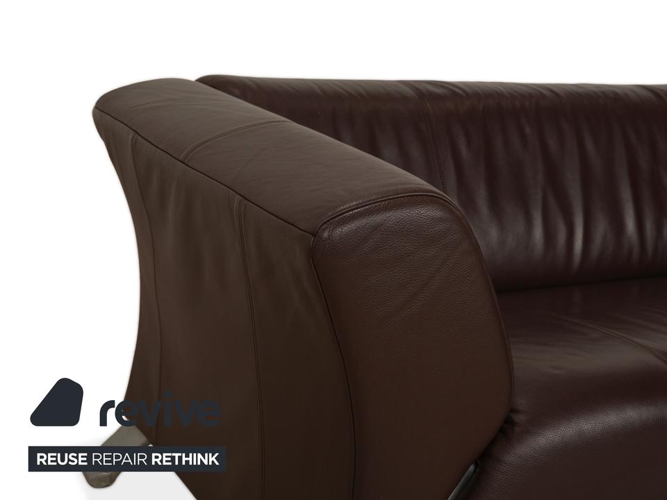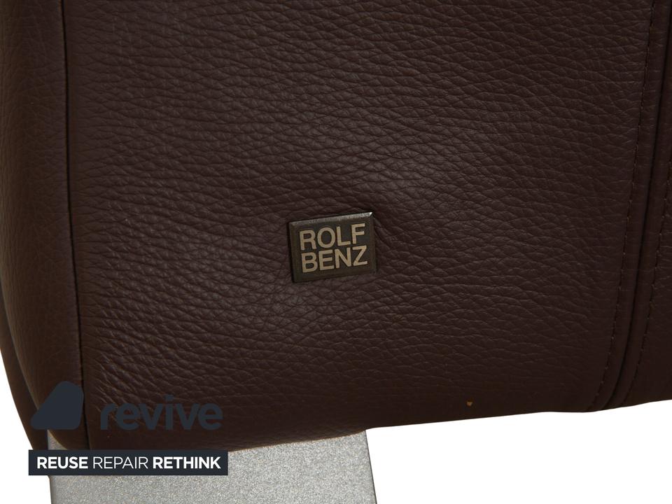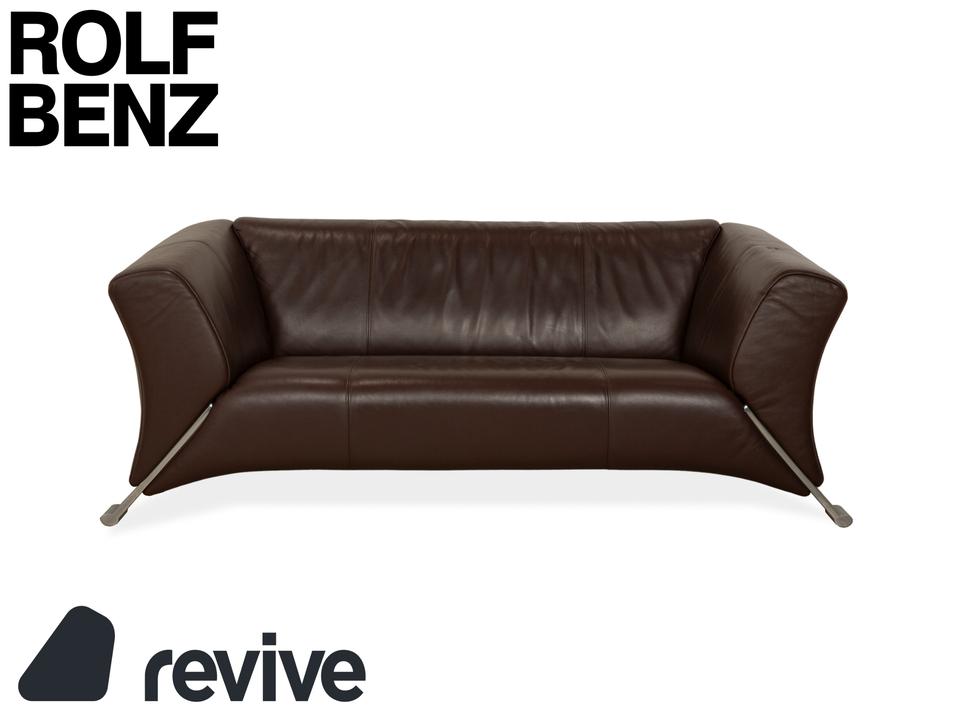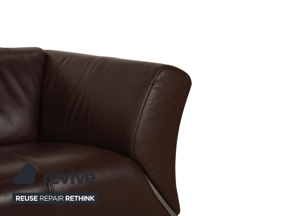 Das Sofa 322 von Rolf Benz ist mit einem modernen dunkelbraunen Leder bezogen und steht auf schräg vom Sofa wegführen Metallfüßen. Der Zweisitzer zeichnet sich durch sein reduziertes und leicht extravagantes Design aus: Rückenlehne und Armlehnen enden in fast gleicher Höhe, was den Fokus stärker auf die Gestaltung der Füße lenkt, die als fortgeführte Linie dem Sofa zu entwachsen scheinen.