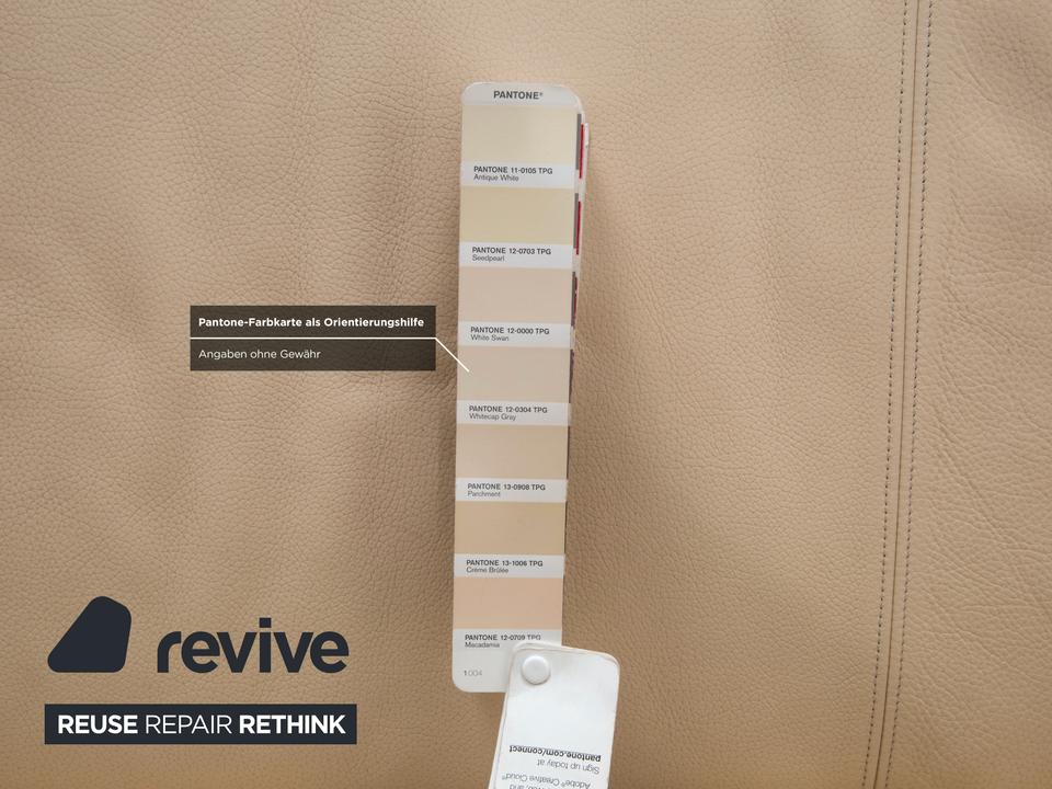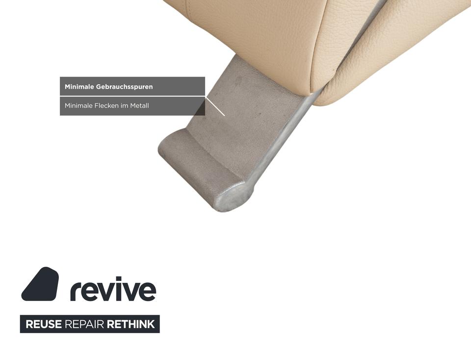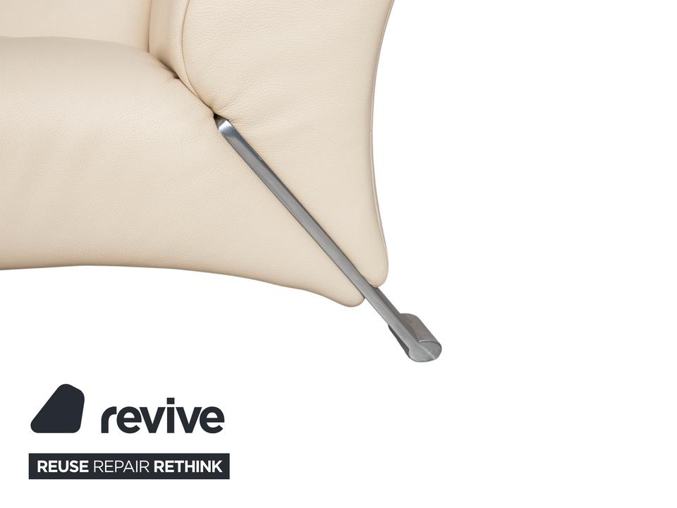 Rolf Benz 322: Ikonisches Design in sanftem CremeDieses Sofa ist ein echter Hingucker und ein Klassiker der Marke Rolf Benz (entworfen von Anita Schmidt). Es beweist, dass kompakte Maße und großer Komfort wunderbar zusammenpassen.Der Zweisitzer ist in hochwertiges Leder in einem eleganten Cremeton (Beige/Off-White) gehüllt. Diese helle Farbe wirkt freundlich, leicht und lässt auch kleinere Räume großzügiger wirken. Die Formensprache ist unverwechselbar: Charakteristisch sind die nach außen geschwungenen Seitenteile und die hohe Rückenlehne. Diese Linienführung wirkt dynamisch und einladend, fast so, als würde das Sofa die Arme öffnen. Die Polsterung ist straff, aber komfortabel, typisch für die langlebige Qualität von Rolf Benz.Ein markantes Detail sind die schräg gestellten Aluminiumfüße. Sie sind matt-silber und verleihen dem Sofa eine besondere Leichtigkeit – es wirkt nicht wie ein massiver Block, sondern scheint fast auf Zehenspitzen zu stehen.