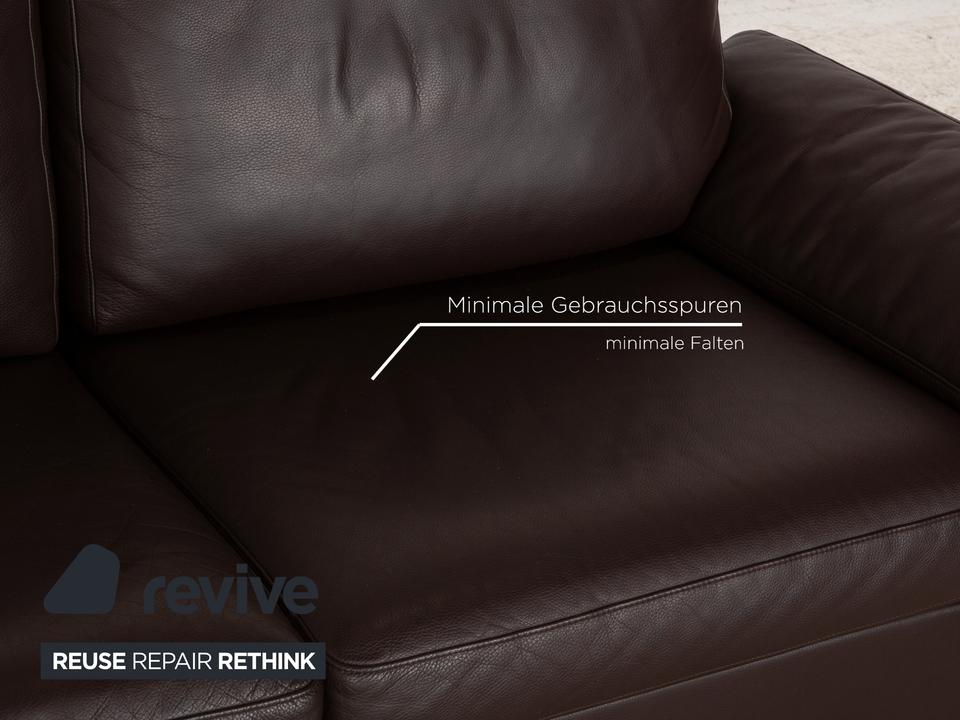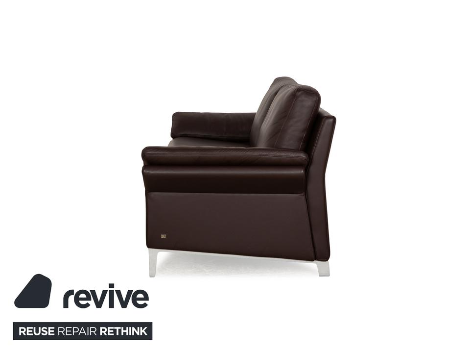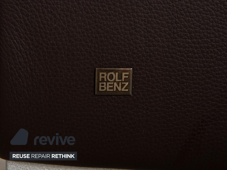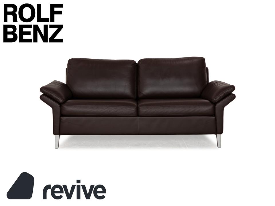 Der Zweisitzer aus der Reihe 3300 von Rolf Benz ist mit einem braunen Echtleder bezogen und steht auf schmal zulaufenden Beinen aus mattem Metall. Der geradlinige Korpus steht im leichten Kontrast zu den leicht abgerundeten Rückenlehnenpolstern und den flach abfallenden Armlehnen.