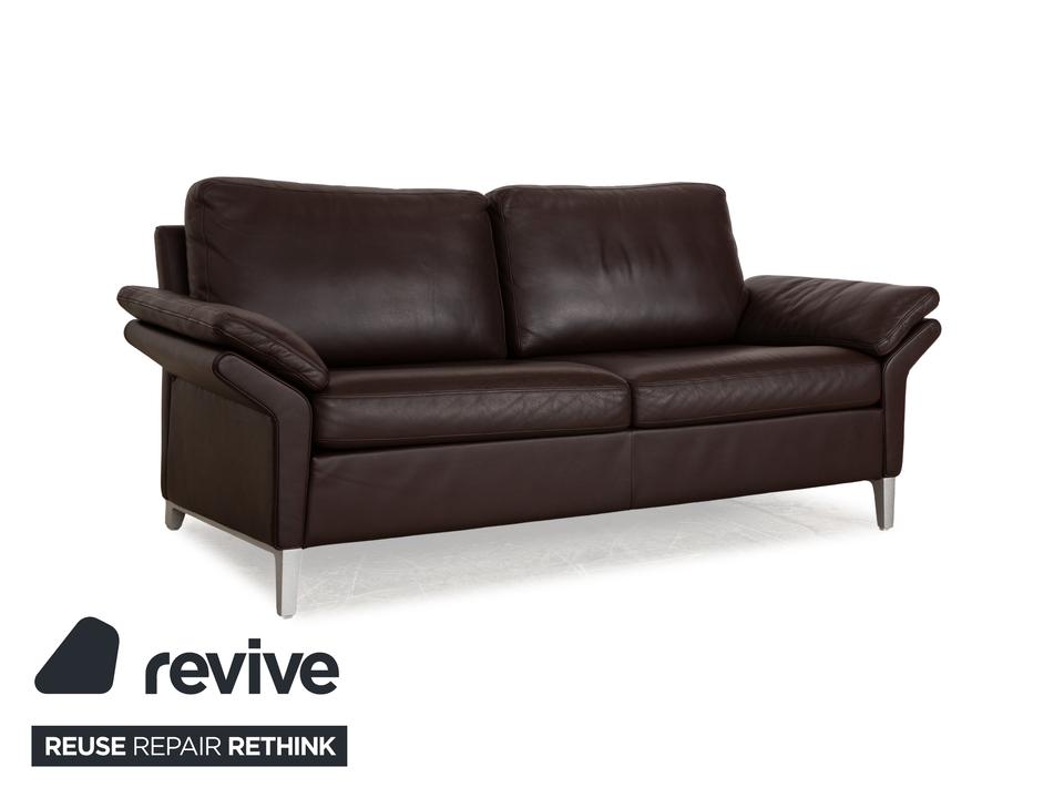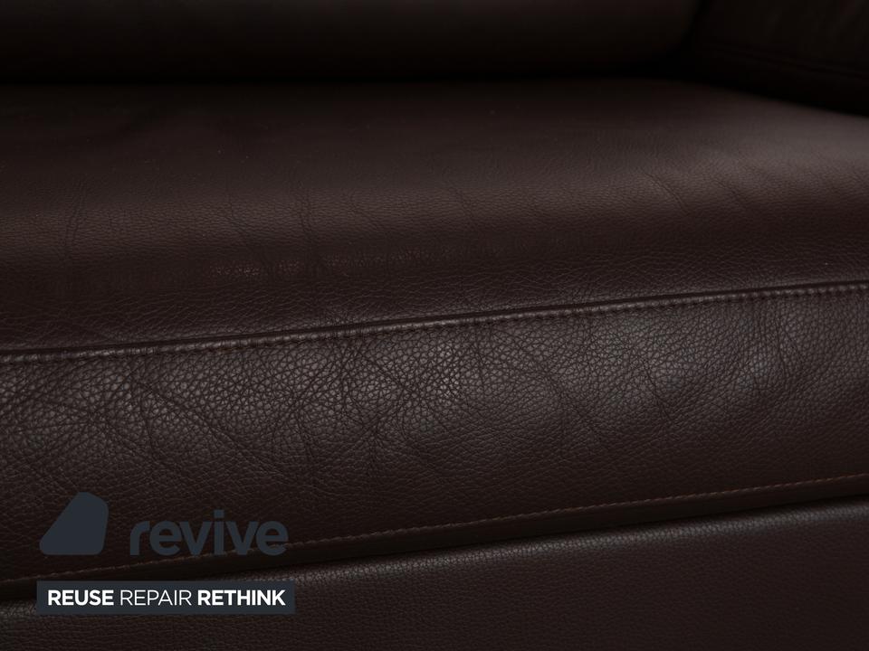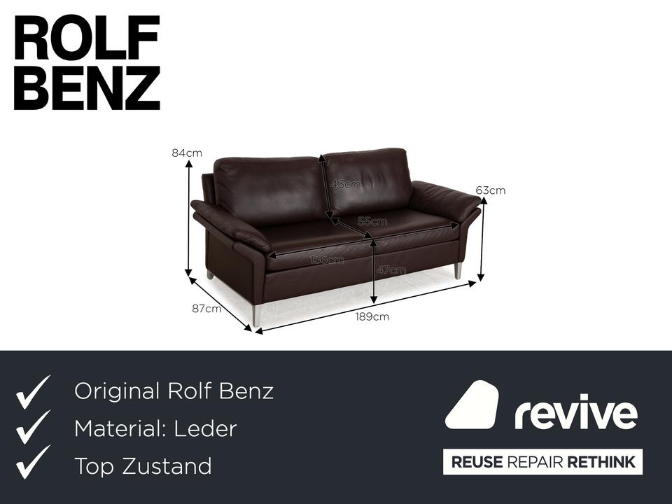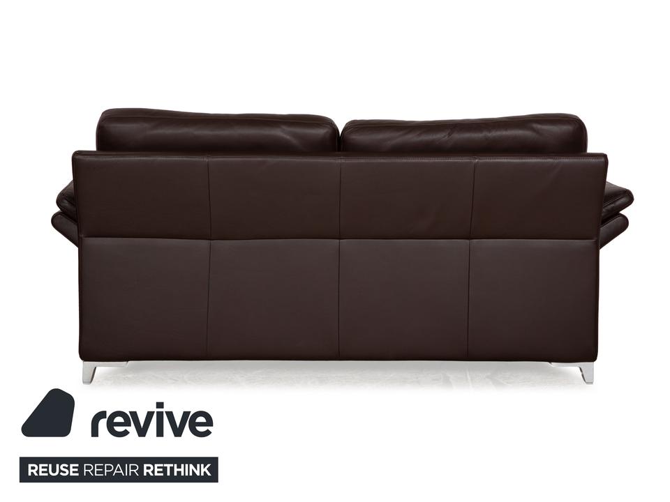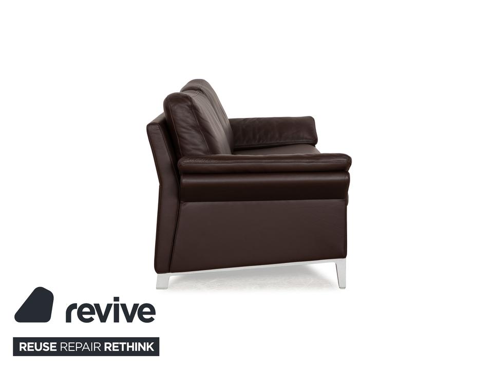 Der Zweisitzer aus der Reihe 3300 von Rolf Benz ist mit einem braunen Echtleder bezogen und steht auf schmal zulaufenden Beinen aus mattem Metall. Der geradlinige Korpus steht im leichten Kontrast zu den leicht abgerundeten Rückenlehnenpolstern und den flach abfallenden Armlehnen.