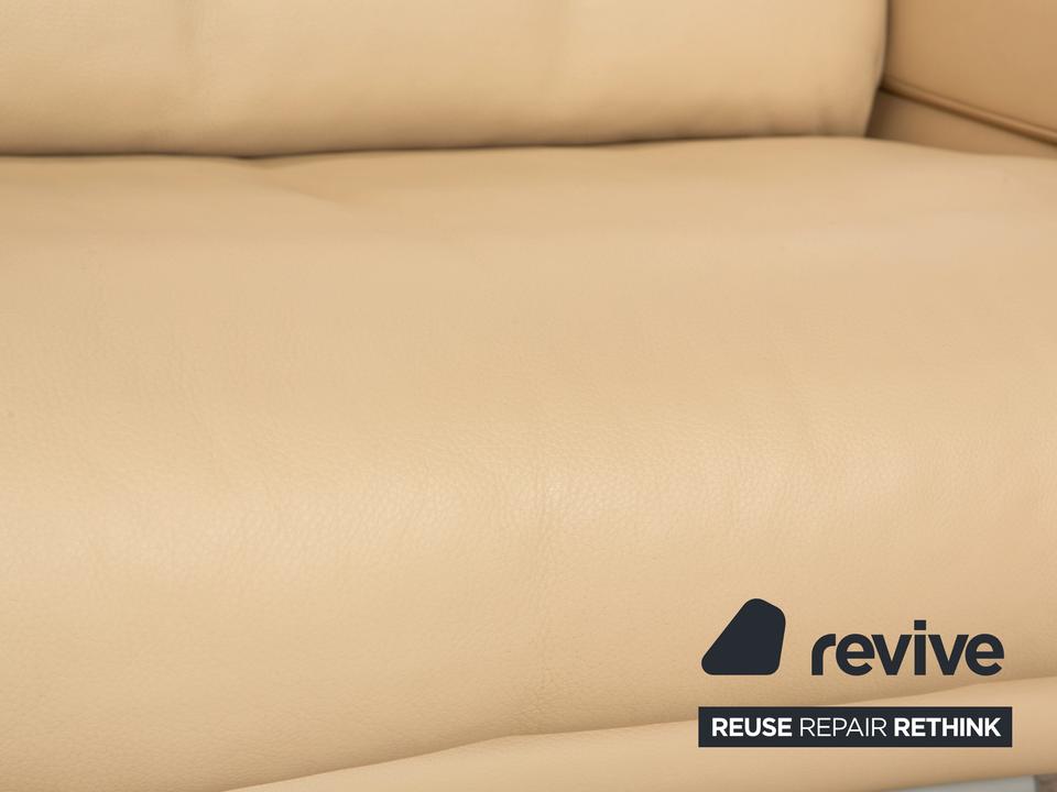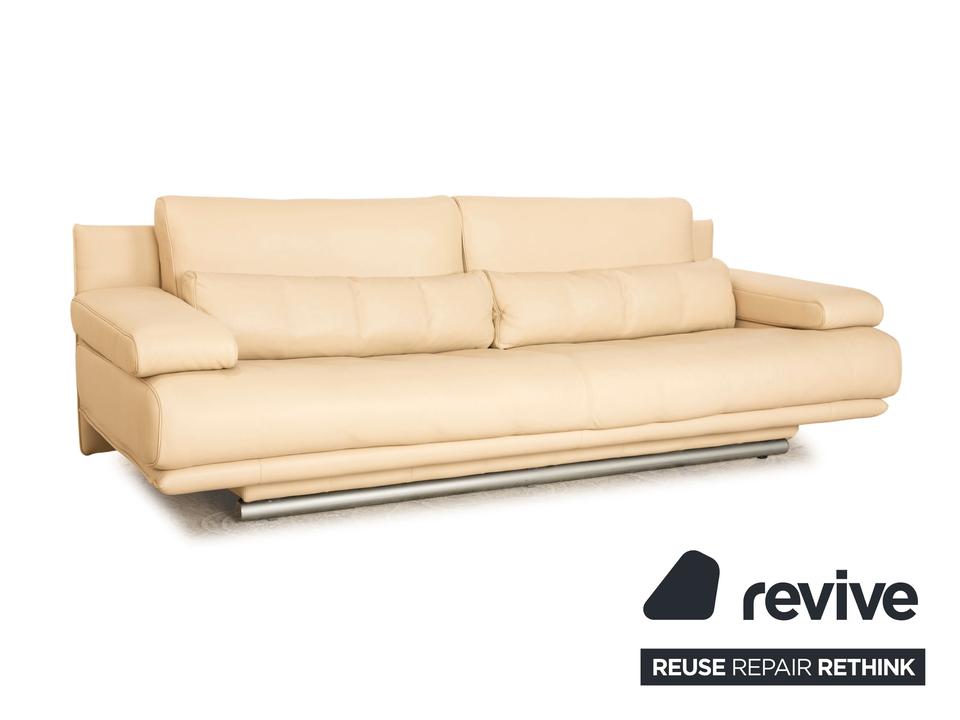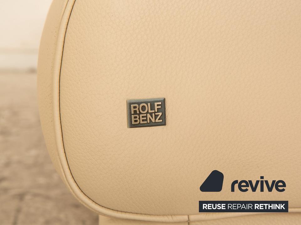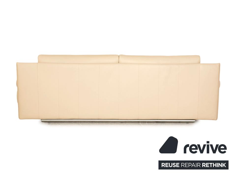 Der 6500 Dreisitzer von Rolf Benz ist mit einem cremefarbenen Echtleder bezogen. Der Klassiker zeichnet sich durch ein einzigartiges Design mit zeitlosem Charakter aus. Die ausgewogene, bequeme Polsterung sowie Stützkissen sorgen für Komfort. Die Rückenlehnen sind verstellbar.
