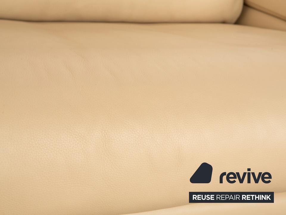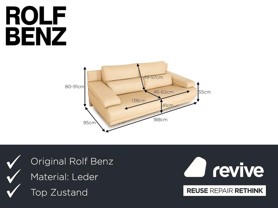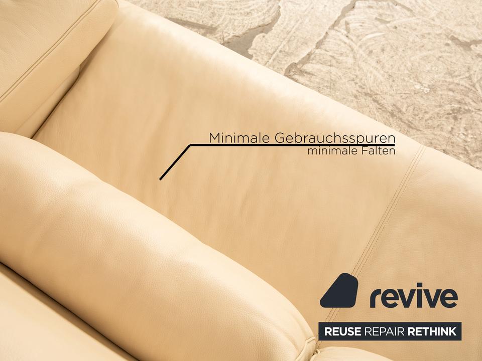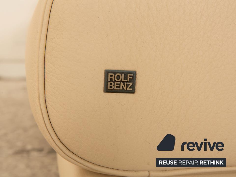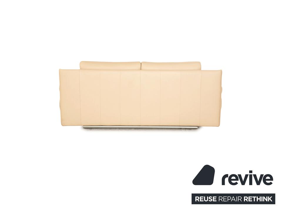 Der 6500 Zweisitzer von Rolf Benz ist mit einem cremefarbenen Echtleder bezogen. Der Klassiker zeichnet sich durch ein einzigartiges Design mit zeitlosem Charakter aus. Die ausgewogene, bequeme Polsterung sowie Stützkissen sorgen für Komfort. Die Rückenlehnen sind verstellbar.