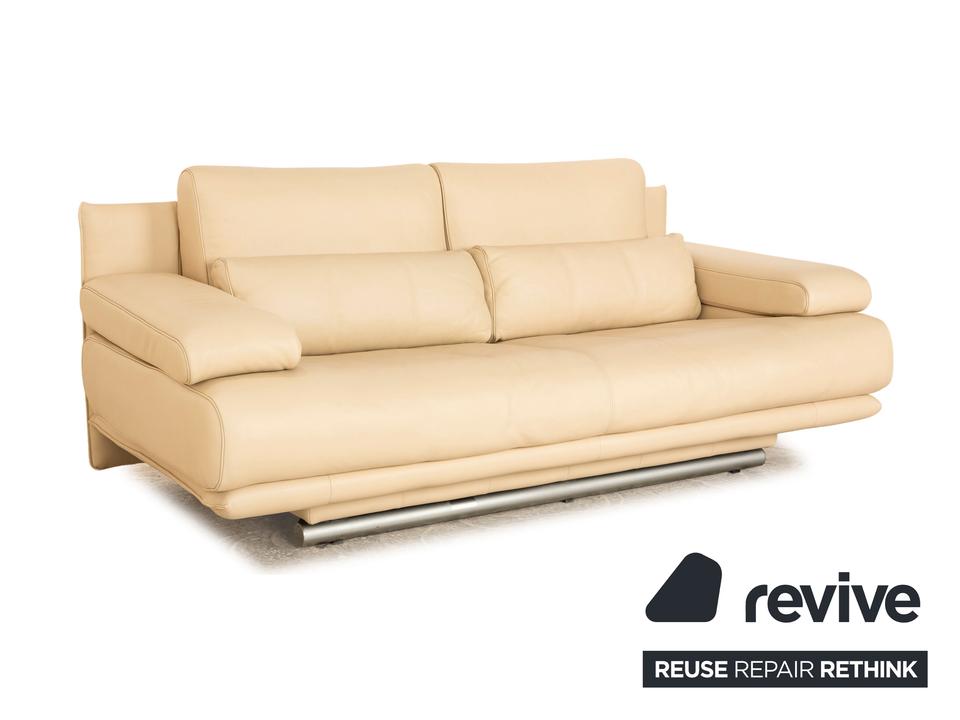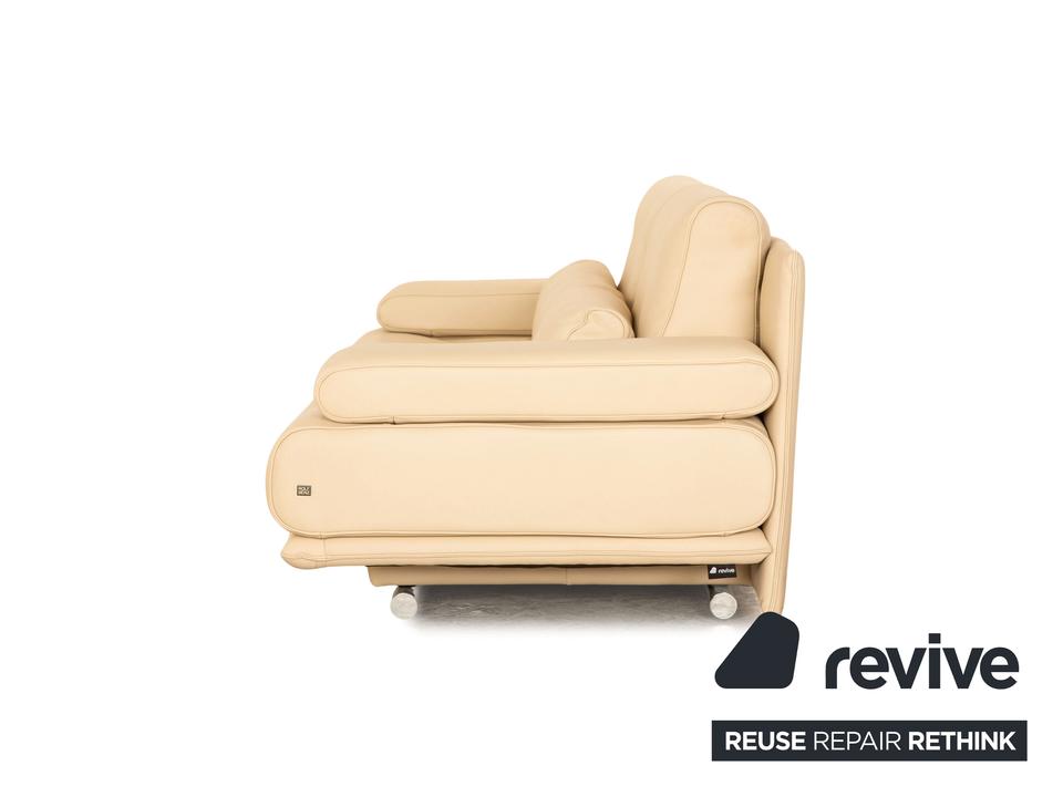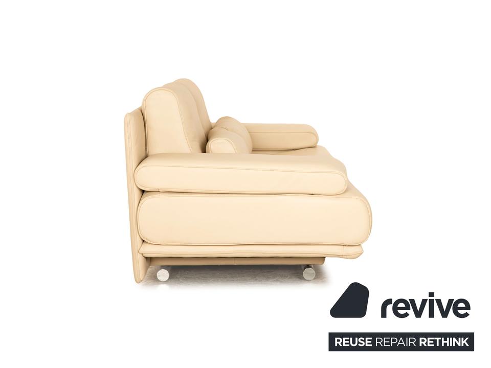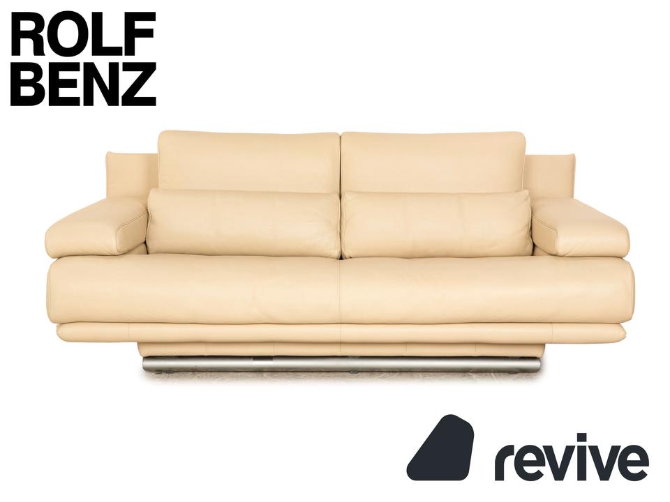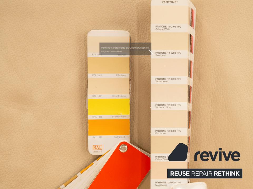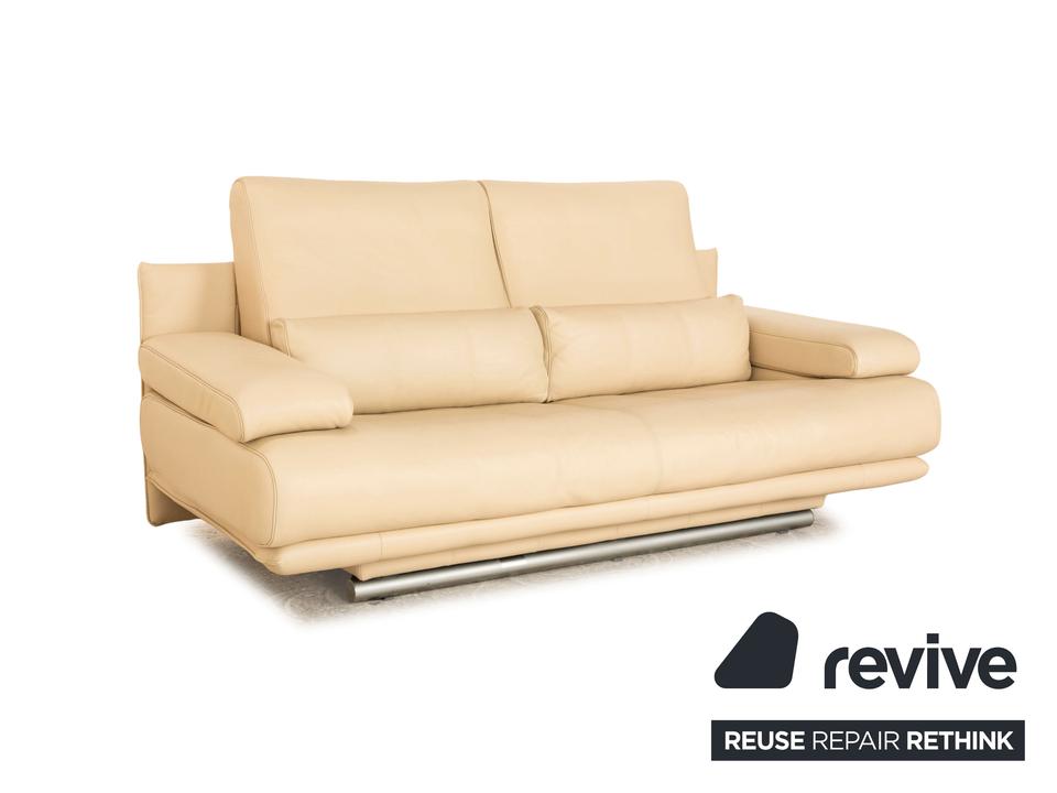 Der 6500 Zweisitzer von Rolf Benz ist mit einem cremefarbenen Echtleder bezogen. Der Klassiker zeichnet sich durch ein einzigartiges Design mit zeitlosem Charakter aus. Die ausgewogene, bequeme Polsterung sowie Stützkissen sorgen für Komfort. Die Rückenlehnen sind verstellbar.
