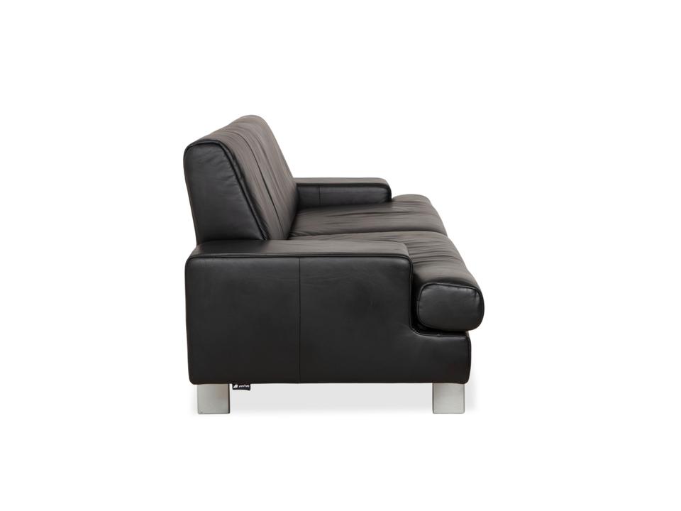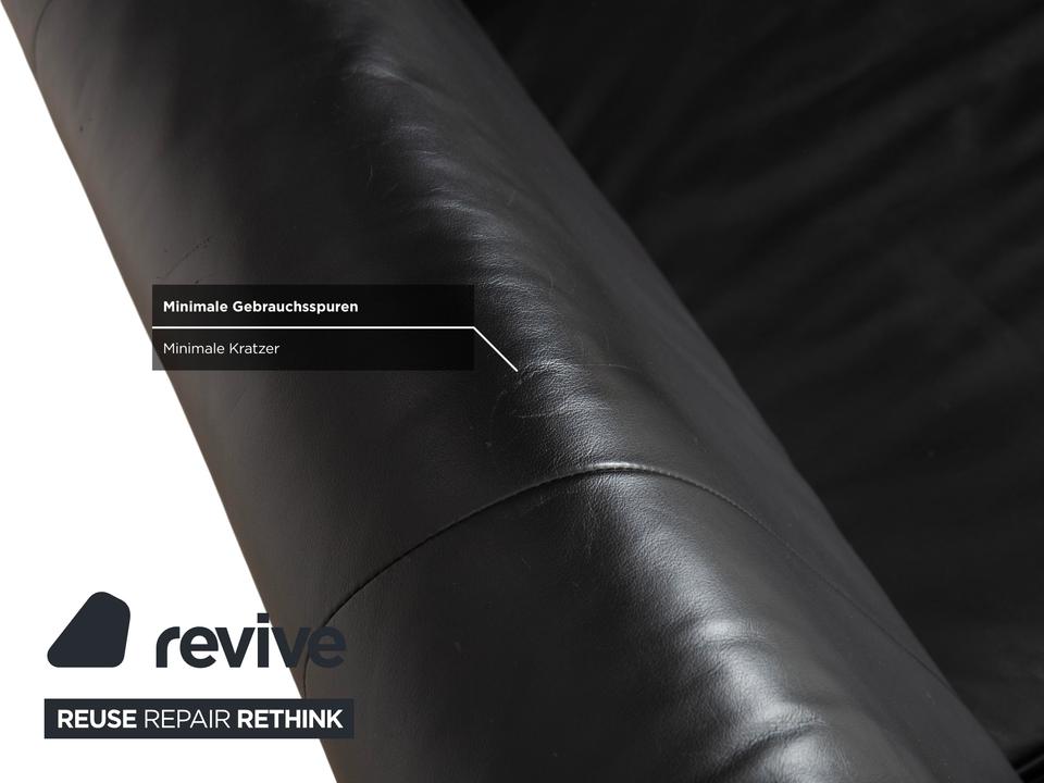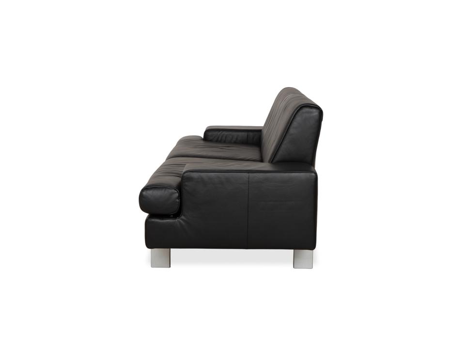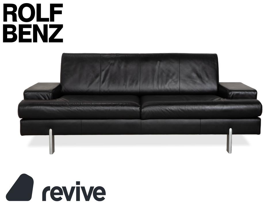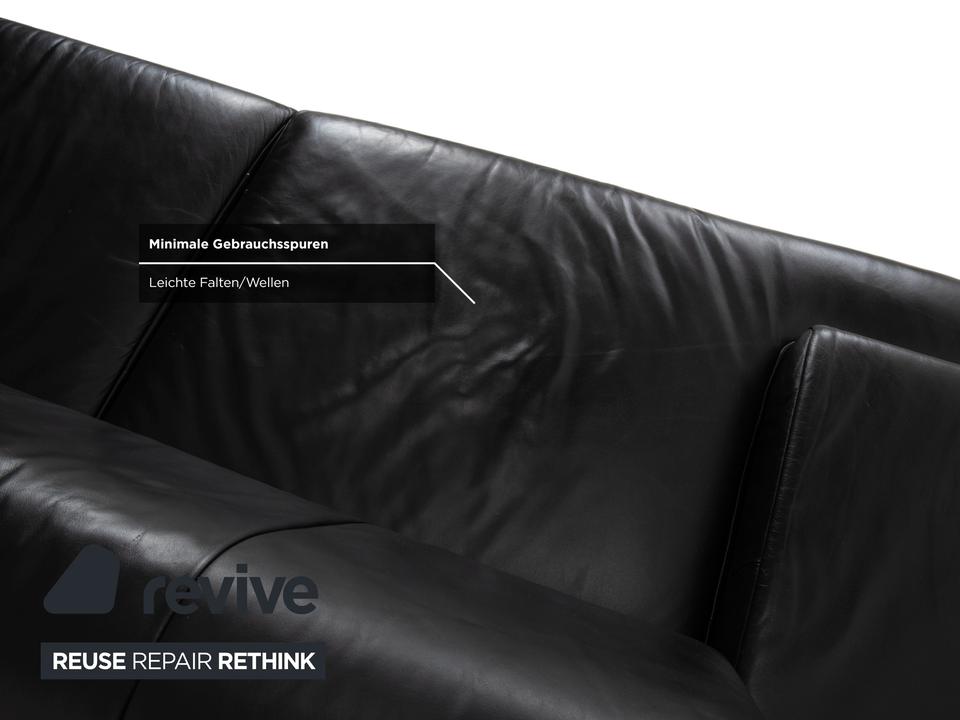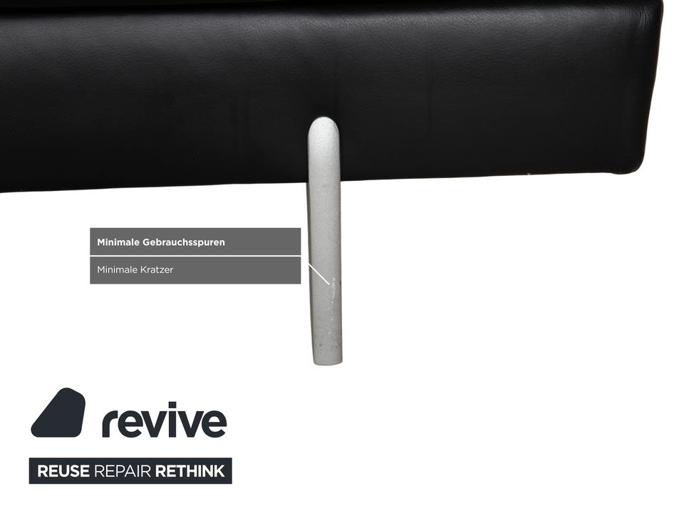 Rolf Benz AK 644: Zeitlose Geradlinigkeit in SchwarzDieses Sofa ist ein Paradebeispiel für das, was Rolf Benz am besten kann: klares, schnörkelloses Design, das Trends überdauert. Das Modell AK 644 besticht durch seine klassische Moderne und eine repräsentative Ausstrahlung.Der Dreisitzer ist in hochwertiges, schwarzes Leder gehüllt. Die Oberfläche ist glatt und zeigt einen dezenten Glanz, der dem Möbelstück eine kühle Eleganz verleiht und es unempfindlich für den Alltag macht. Die Formensprache ist streng geometrisch und kubisch: Die Linien verlaufen horizontal und ruhig. Besonders markant sind die breiten, flachen Armlehnen, die wie massive Blöcke wirken und das Design an den Seiten solide abschließen.Die Sitz- und Rückenfläche ist optisch in zwei breite Segmente unterteilt, bietet aber großzügigen Platz für drei Personen. Die Polsterung wirkt straff und formstabil, ideal für aufrechtes, komfortables Sitzen. Getragen wird der massive Korpus von schlichten, silbernen Metallfüßen in Zylinderform. Sie heben das Sofa leicht an, sorgen für einen sicheren Stand und setzen einen modernen, hellen Akzent zum tiefen Schwarz des Leders.