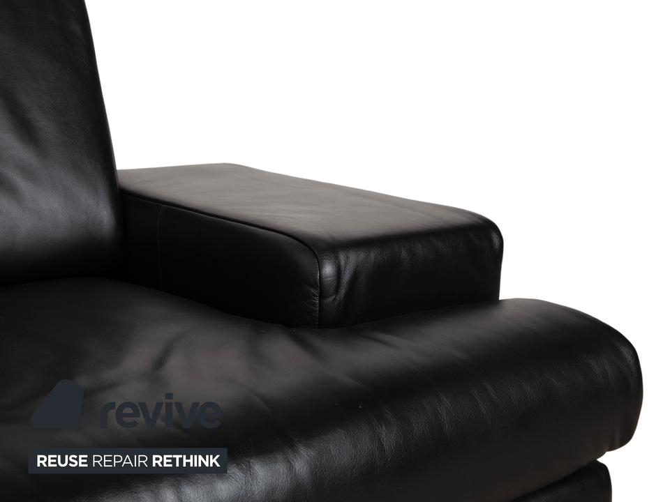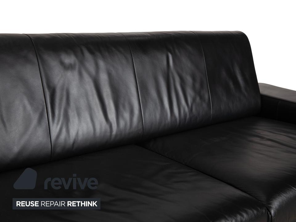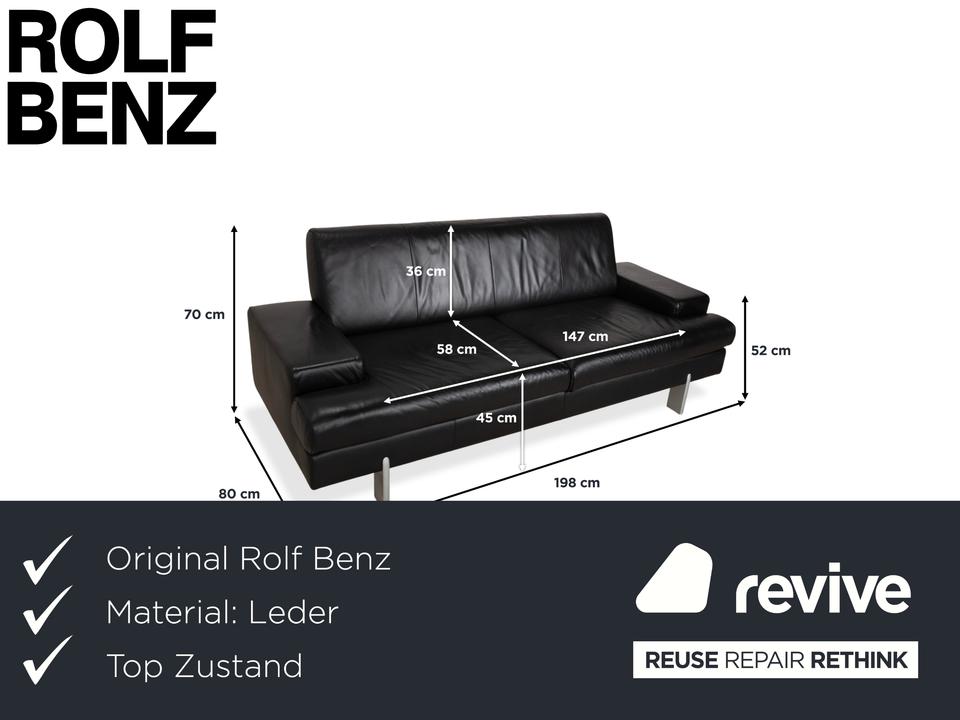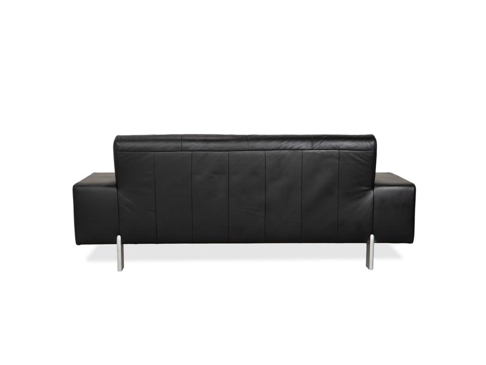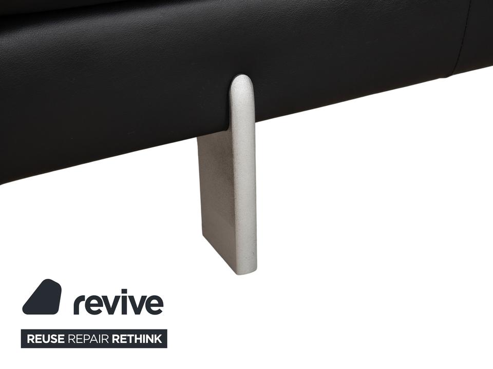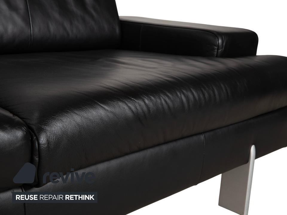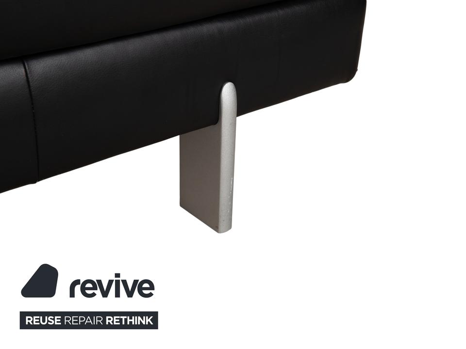 Rolf Benz AK 644: Zeitlose Geradlinigkeit in SchwarzDieses Sofa ist ein Paradebeispiel für das, was Rolf Benz am besten kann: klares, schnörkelloses Design, das Trends überdauert. Das Modell AK 644 besticht durch seine klassische Moderne und eine repräsentative Ausstrahlung.Der Dreisitzer ist in hochwertiges, schwarzes Leder gehüllt. Die Oberfläche ist glatt und zeigt einen dezenten Glanz, der dem Möbelstück eine kühle Eleganz verleiht und es unempfindlich für den Alltag macht. Die Formensprache ist streng geometrisch und kubisch: Die Linien verlaufen horizontal und ruhig. Besonders markant sind die breiten, flachen Armlehnen, die wie massive Blöcke wirken und das Design an den Seiten solide abschließen.Die Sitz- und Rückenfläche ist optisch in zwei breite Segmente unterteilt, bietet aber großzügigen Platz für drei Personen. Die Polsterung wirkt straff und formstabil, ideal für aufrechtes, komfortables Sitzen. Getragen wird der massive Korpus von schlichten, silbernen Metallfüßen in Zylinderform. Sie heben das Sofa leicht an, sorgen für einen sicheren Stand und setzen einen modernen, hellen Akzent zum tiefen Schwarz des Leders.