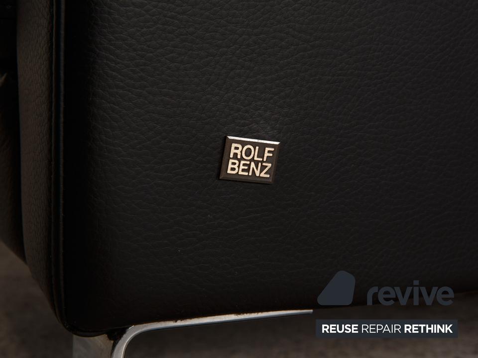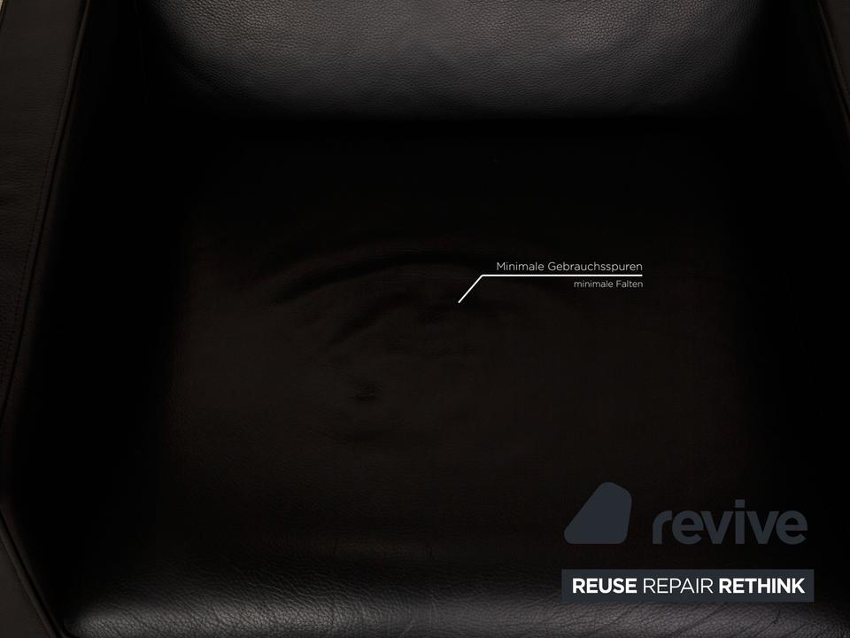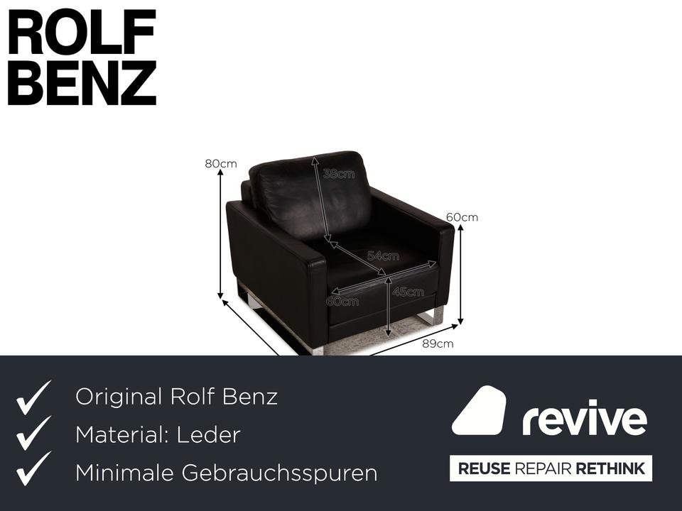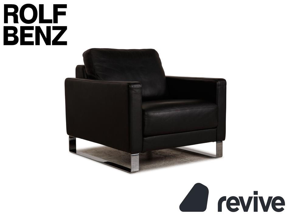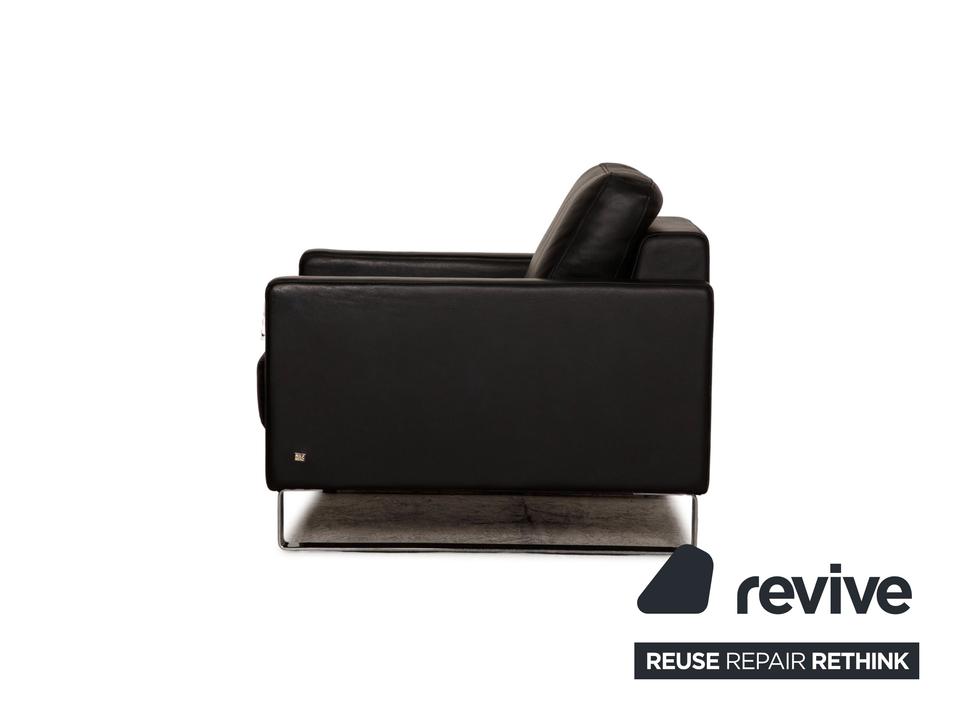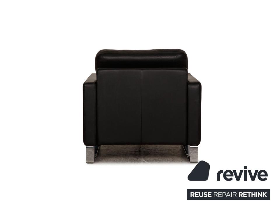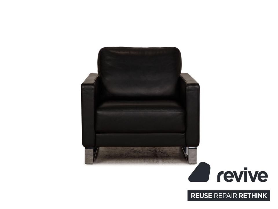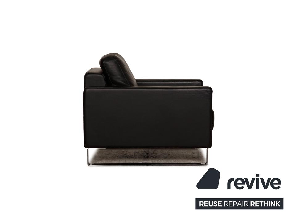 Der Ego Sessel von Rolf Benz ist mit einem schwarzen Echtleder bezogen und steht auf silbernen Metallfüßen. Das klassische, zeitlose Design und abgerundeten Kanten zeichnen ihn aus.