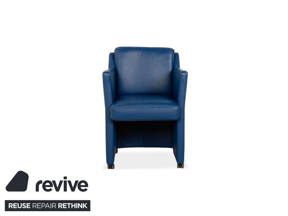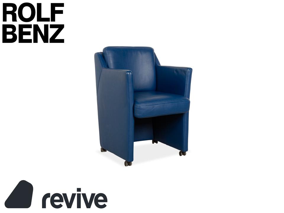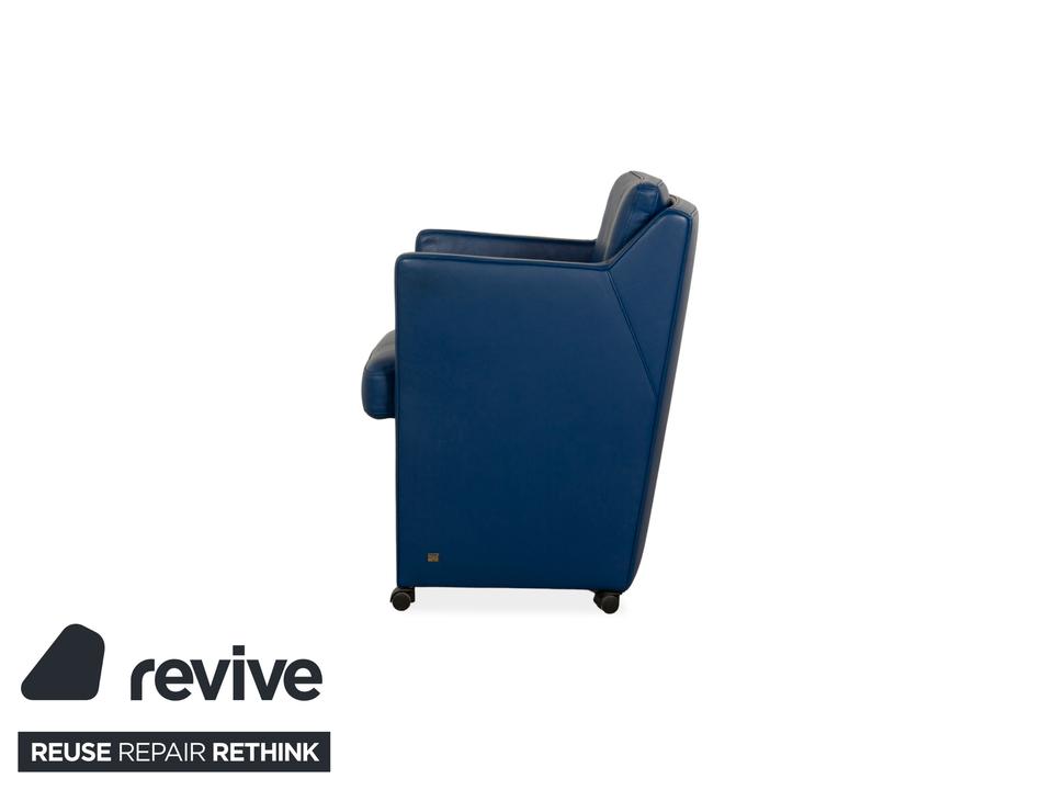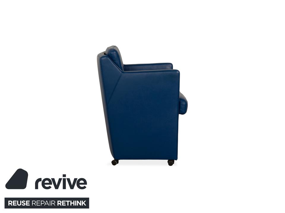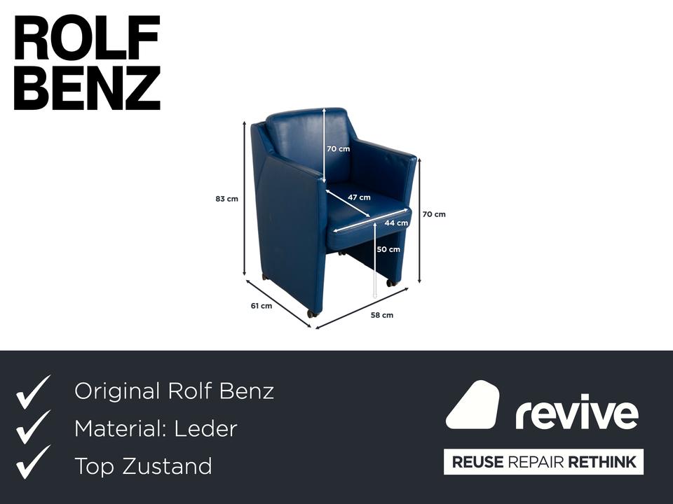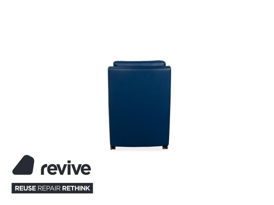 Der Rolf Benz Sessel ist mit einem dunkelblauen Echtleder bezogen und steht auf schwarzen Rollen. Die praktischen Armlehnen und das zeitlose Design zeichnen ihn aus.