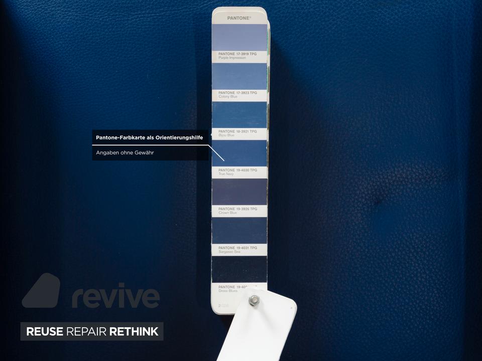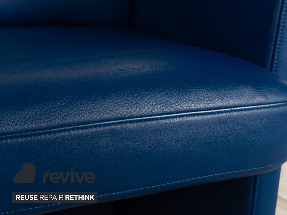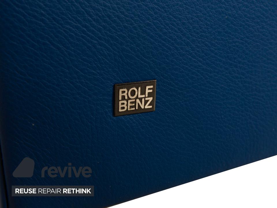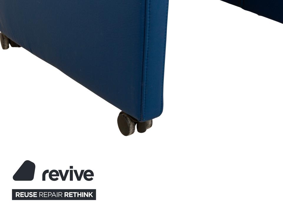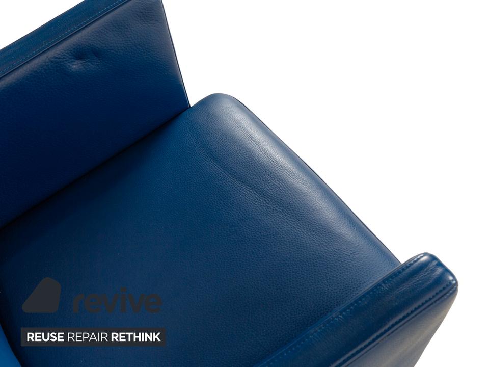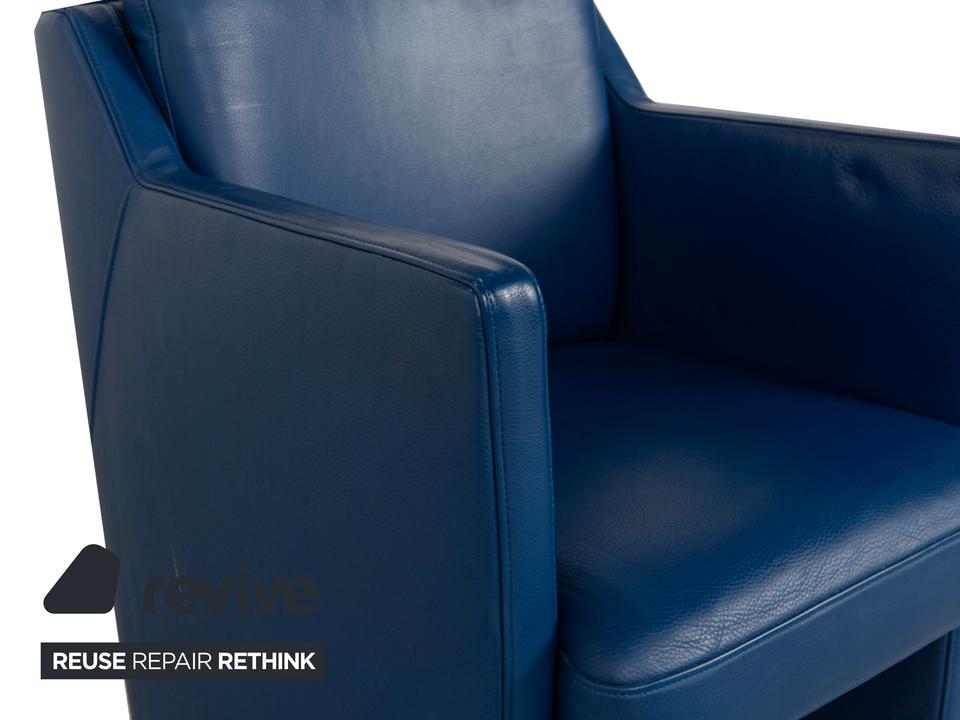 Der Rolf Benz Sessel ist mit einem dunkelblauen Echtleder bezogen und steht auf schwarzen Rollen. Die praktischen Armlehnen und das zeitlose Design zeichnen ihn aus.