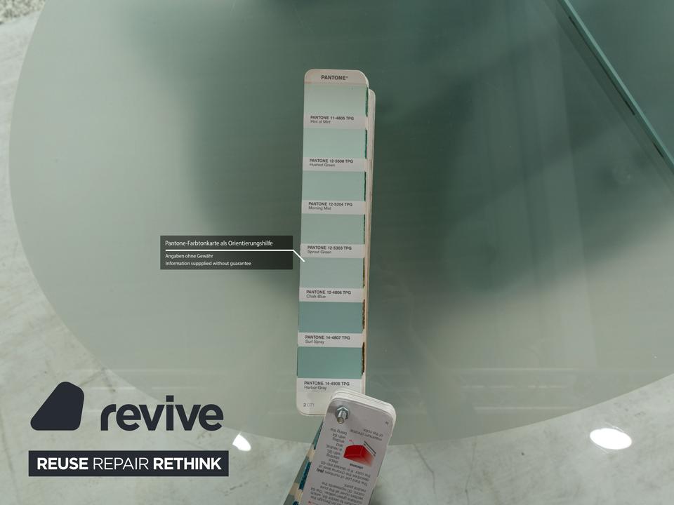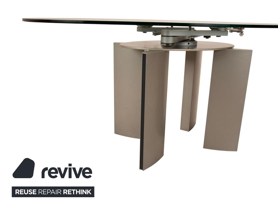 Der Esstisch aus Glas und Metall von Ronald Schmitt ist eine extravagante Ergänzung für das moderne Esszimmer. Die runde Grundform der Tischplatte lässt sich durch einen Mechanismus von 160cm auf 220cm erweitern, wodurch eine ovale Fläche entsteht. Die außergewöhnlich geformten Beine machen diesen Tisch zu einem wahren Hingucker.