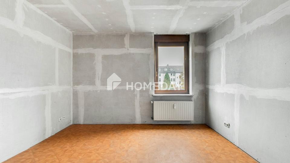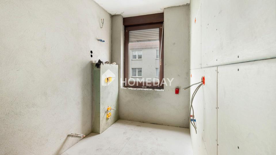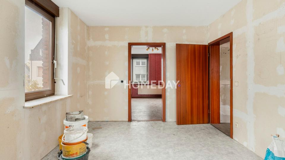 Das rechte Mehrfamilienhaus ist dagegen in einem fortgeschritteneren Zustand. Eine leere Wohnung im Erdgeschoss wird im Exposé fotografisch festgehalten, während im Obergeschoss zwei Wohnungen zu einer großen Einheit zusammengelegt wurden, die aktuell leersteht. Das Dachgeschoss ist vollständig ausgebaut, Gas- und Stromleitungen wurden bereits verlegt. Darüber hinaus gehört zu diesem Haus eine weitere Wohnung, die nach hinten zum Hof ausgerichtet ist. Diese etwa 50 Quadratmeter große Einheit wurde vor drei Jahren vollständig renoviert.