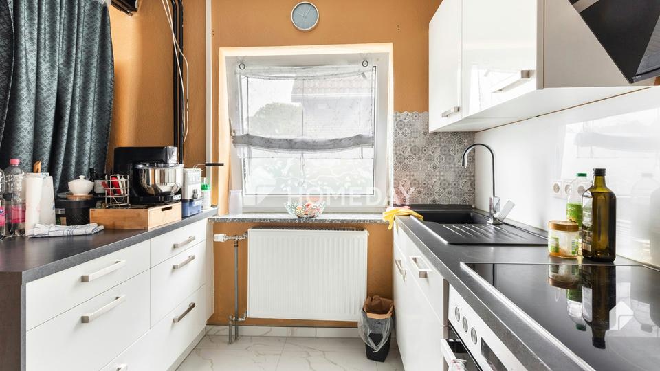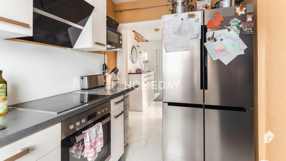 Die top ausgestattete Küche mit hochwertiger Einbauküche und schönem neuen Fliesenboden im Naturstein-Style?