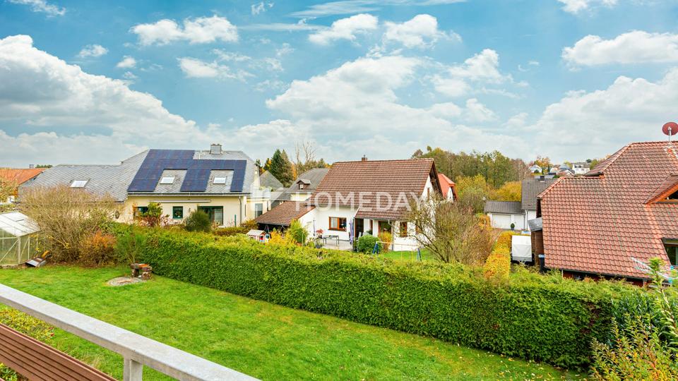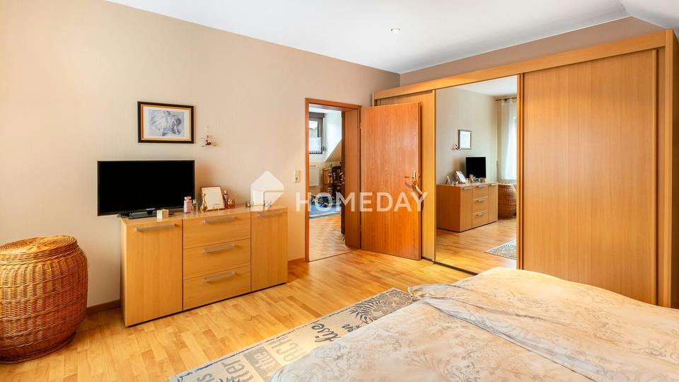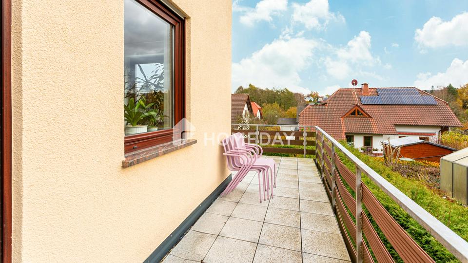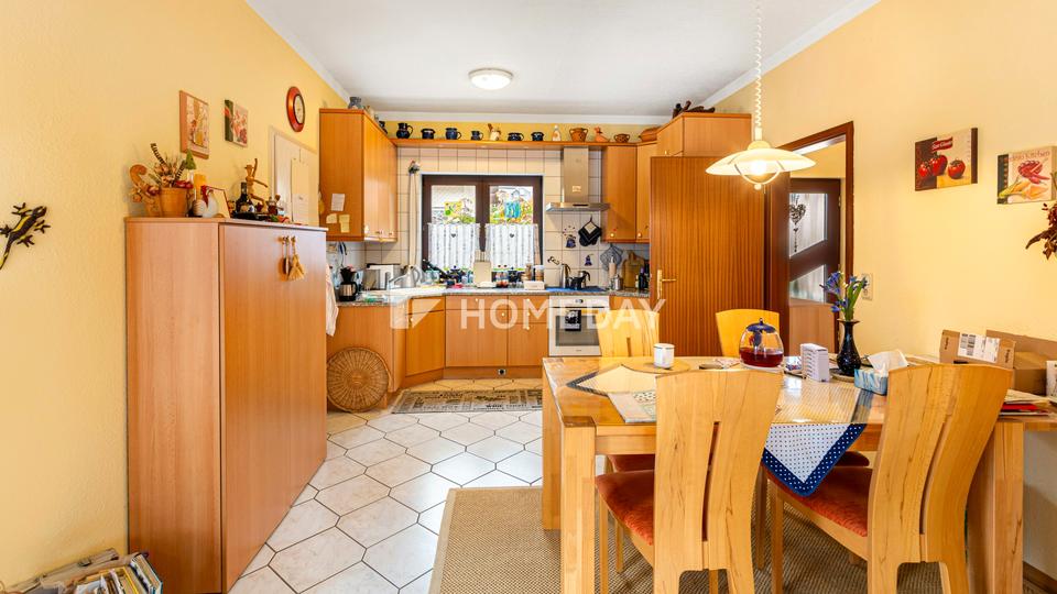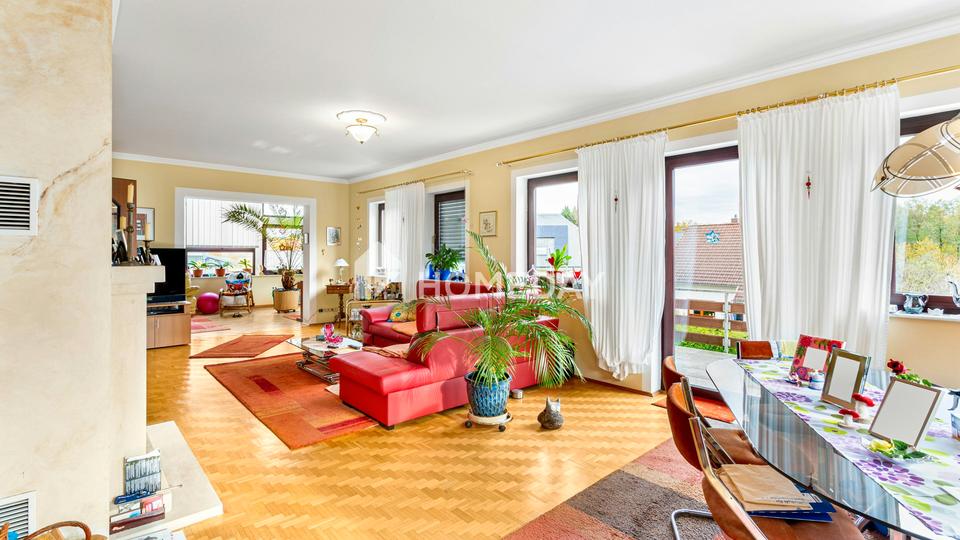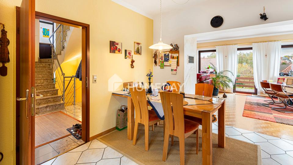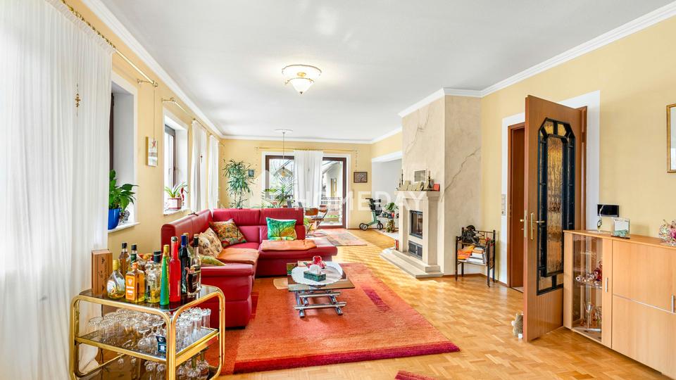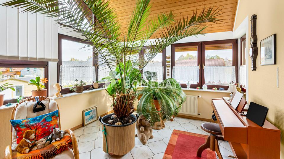 Das im Jahr 1995 errichtete Haus besteht aus hochwertigen Bimssteinmauern und einem eleganten Schieferdach, das den langlebigen Charakter der Immobilie unterstreicht. Auf rund 292 Quadratmetern Wohnfläche verteilen sich fünf gut geschnittene Zimmer sowie mehrere Nebenräume, die vielfältige Nutzungsmöglichkeiten bieten. Der Wintergarten mit Blick ins Grüne schafft ein angenehmes Wohnambiente und erweitert den Wohnraum auf besondere Weise.