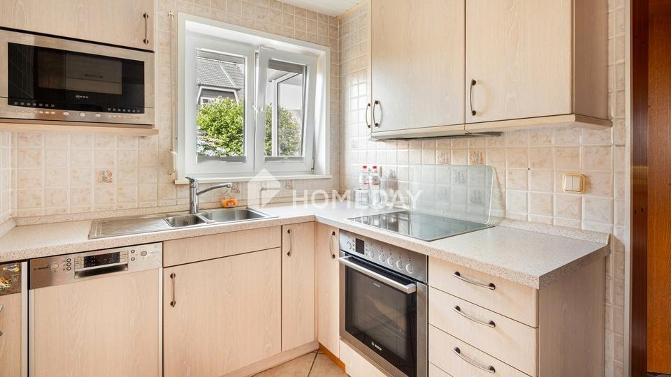 Im Erdgeschoss liegt eine großzügige Dreizimmerwohnung mit hellem Wohn- und Essbereich, in dem der Kachelofen für gemütliche Wärme sorgt. Die angrenzende Küche ist mit Bosch-Geräten ausgestattet. Praktische Einbauschränke im Flur schaffen Stauraum. Ein Gäste-WC sowie ein Tageslichtbad mit bodengleicher Dusche, Badewanne und Bidet ergänzen die beiden Schlafzimmer dieser Einheit.