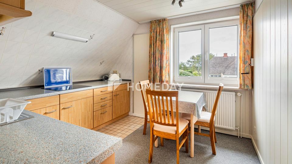 Über eine Treppe ist der Spitzboden erreichbar, der zusätzliche Stellfläche bietet. Der Keller ist voll ausgebaut, größtenteils beheizt und eröffnet damit weitere Möglichkeiten – ein großer Vorteil auf Sylt.