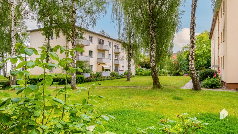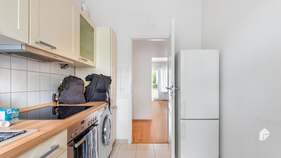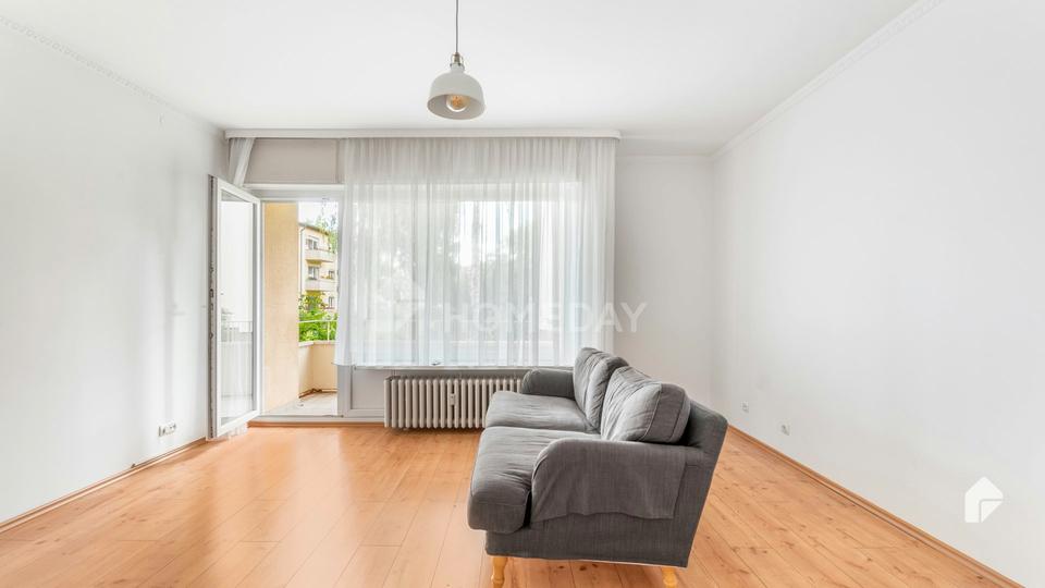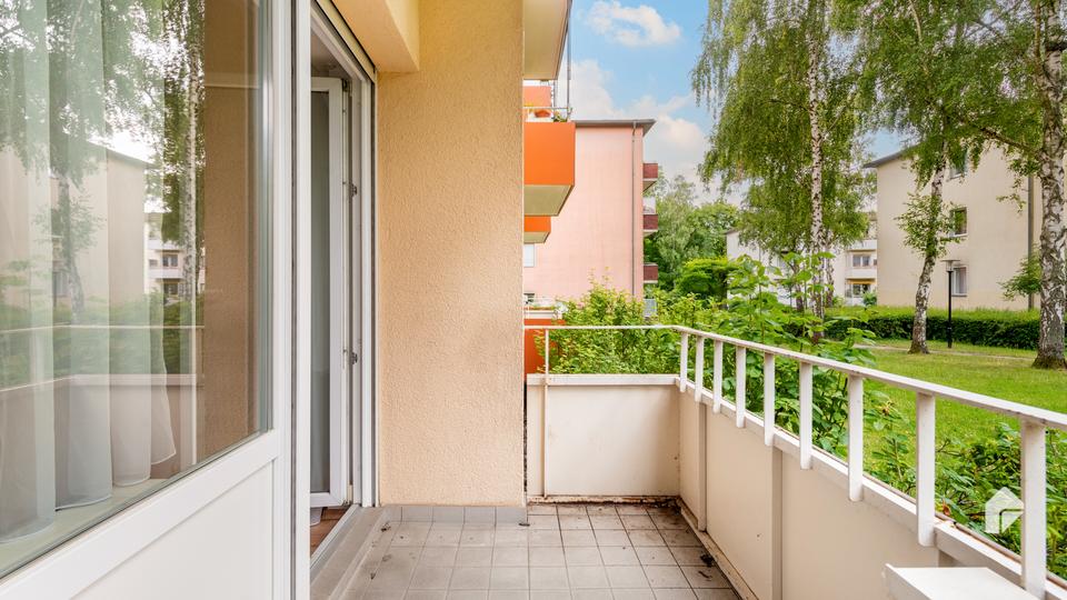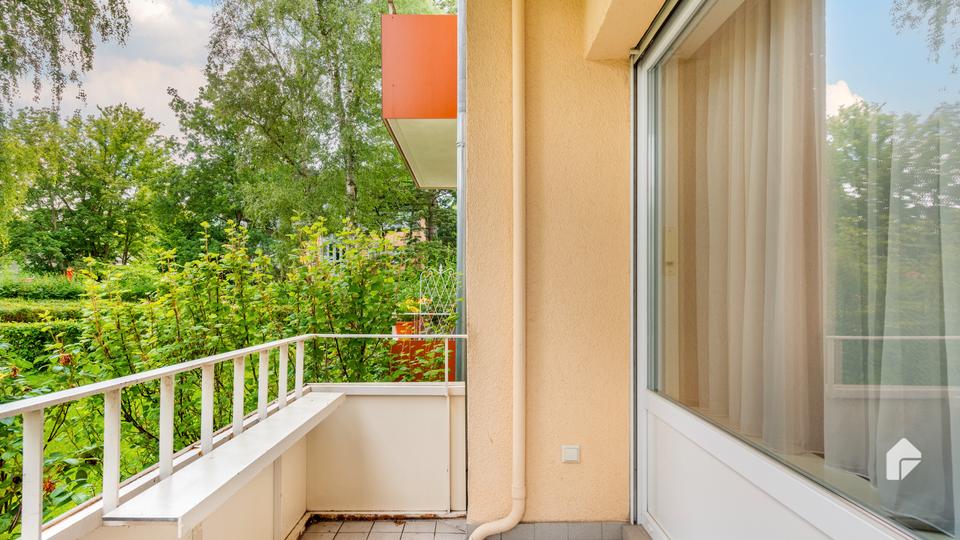 Das Highlight der Wohnung ist das helle Wohnzimmer, das durch große Fenster viel Tageslicht einfängt. Von hier aus gelangen Sie direkt auf den Balkon, der mit seinem herrlichen Ausblick in die Grünanlage zum Entspannen einlädt. Stellen Sie sich vor, wie Sie nach einem erfolgreichen Tag bei einem guten Buch und einer Tasse Tee die Ruhe genießen.