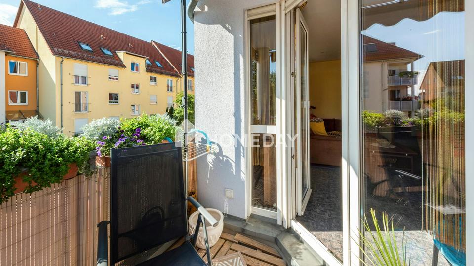 Ein echtes Highlight der Wohnung ist das helle, gemütliche Wohnzimmer. Die großzügige Fensterfront sorgt nicht nur für viel Tageslicht, sondern öffnet auch den Zugang zum überdachten Südwest-Balkon. Mit rund 4,7 m² lädt dieser zu entspannten Momenten im Freien ein. Die clevere Raumaufteilung trennt Wohn- und Essbereich optisch voneinander und schafft so eine behagliche Atmosphäre für Alltag und Gäste.