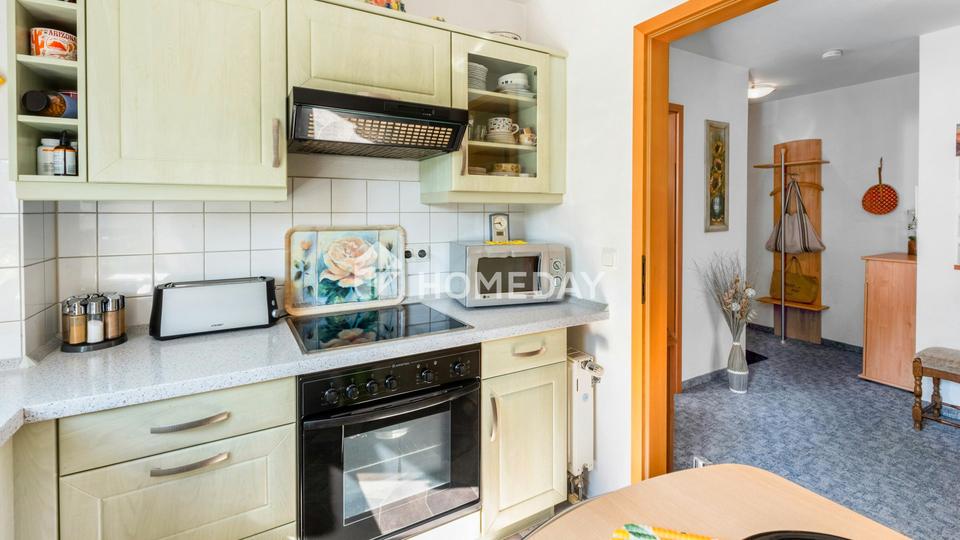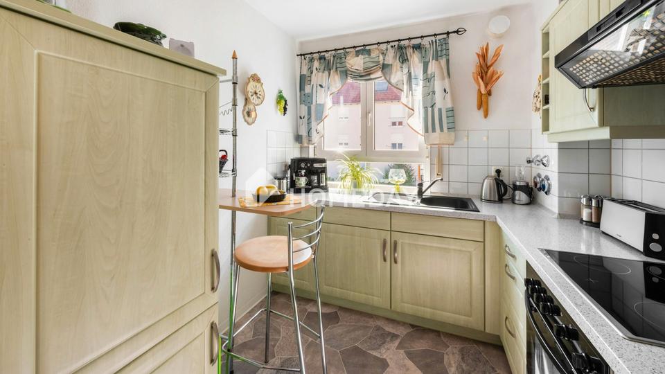 Angrenzend befindet sich die separate Küche, die mit funktionaler Ausstattung und einem kleinen Frühstücksplatz punktet. Hier wird Kochen zum Vergnügen – dank praktischer Anordnung und wohnlicher Gestaltung. Ergänzt wird das Raumangebot durch ein gepflegtes, innenliegendes Wannenbad, das sich harmonisch ins Gesamtbild der Wohnung einfügt.