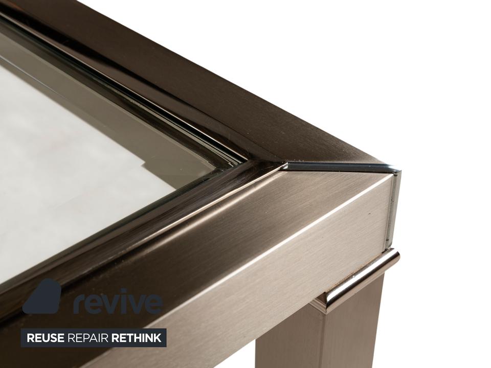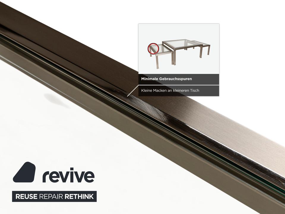 Hier bekommst du ein super schickes Set der italienischen Marke Sovet Italia. Das Set besteht aus drei Tischen: einem großen quadratischen Couchtisch und zwei kleineren Beistelltischen, die sich dank der unterschiedlichen Höhen perfekt ineinander schieben lassen.Die Kombination aus dem filigranen, silberfarbenen Metallgestell und den klaren Glasplatten sorgt für einen extrem aufgeräumten und modernen Look. Durch die Profile der Gestelle wirken die Tische trotz ihrer soliden Bauweise angenehm leicht im Raum. Besonders praktisch: Wenn du mal mehr Platz brauchst, passen die kleineren Tische einfach unter den Größeren, und wenn du mehr Platz brauchst, ziehst du dir die Ablagefläche genau dorthin, wo du sie gerade brauchst.