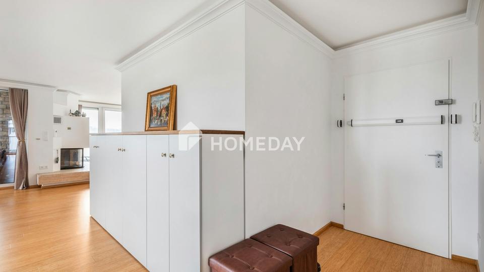 Über einen Aufzug gelangen Sie bequem in die oberste Etage des Hauses, wo Sie ein einladender Flur empfängt, der sich elegant in den großzügigen Wohnbereich öffnet. Das Herzstück der Wohnung ist das weitläufige, helle Wohnzimmer mit einer bodentiefen Fensterfront, edlem Holzdielenboden und einem modernen Kamin, der an kühlen Tagen für wohlige Atmosphäre sorgt. Der Raum geht fließend in den offenen Küchenbereich über, der mit einer hochwertigen, maßgefertigten Einbauküche ausgestattet ist.