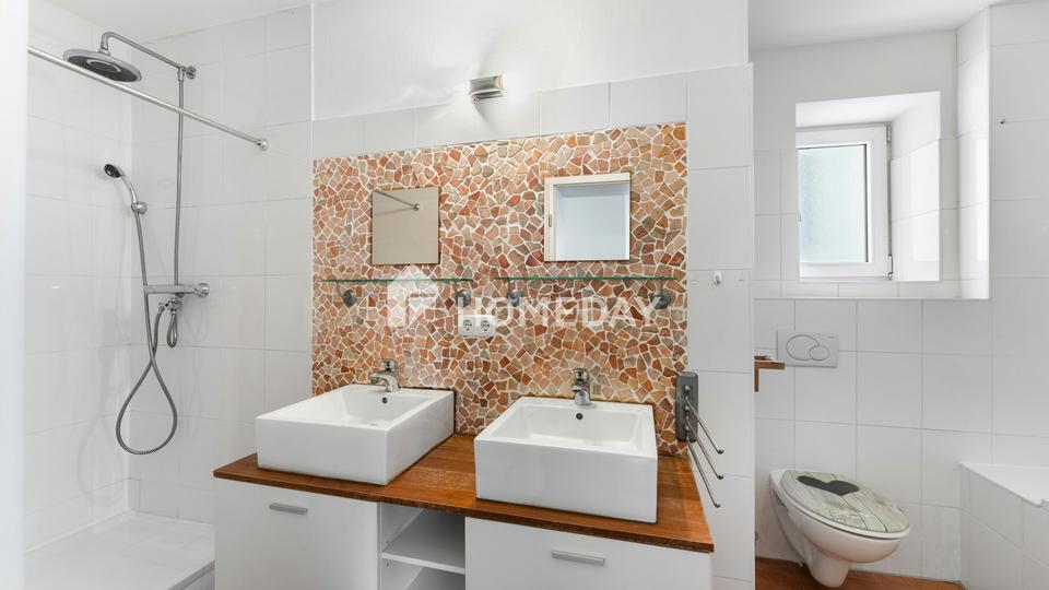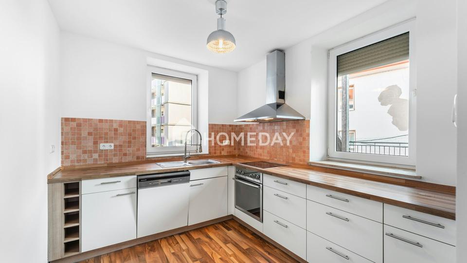 Die offen gestaltete Küche samt Einbauküche präsentiert sich modern und zugleich einladend. Die durchdachte Anordnung der Arbeitsflächen und ein Fenster schaffen eine angenehme Atmosphäre zum Kochen und Verweilen. Das Badezimmer überzeugt mit zeitlosen Fliesen sowie einer komfortablen Ausstattung, die sowohl eine übergroßen Dusche als auch eine Badewanne umfasst. Helle Oberflächen und ein Fenster sorgen für Frische und Tageslicht.