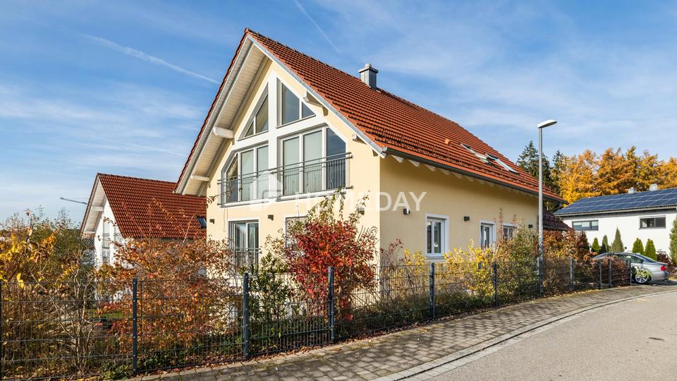 Ausstattung: Schon beim Betreten des Außenbereichs zeigt sich der besondere Charakter dieses 2013 erbauten Einfamilienhauses. Auf einem ca. 633 Quadratmeter großen Grundstück eröffnet sich ein liebevoll gepflegter Garten, der dank Terrasse und Win…
