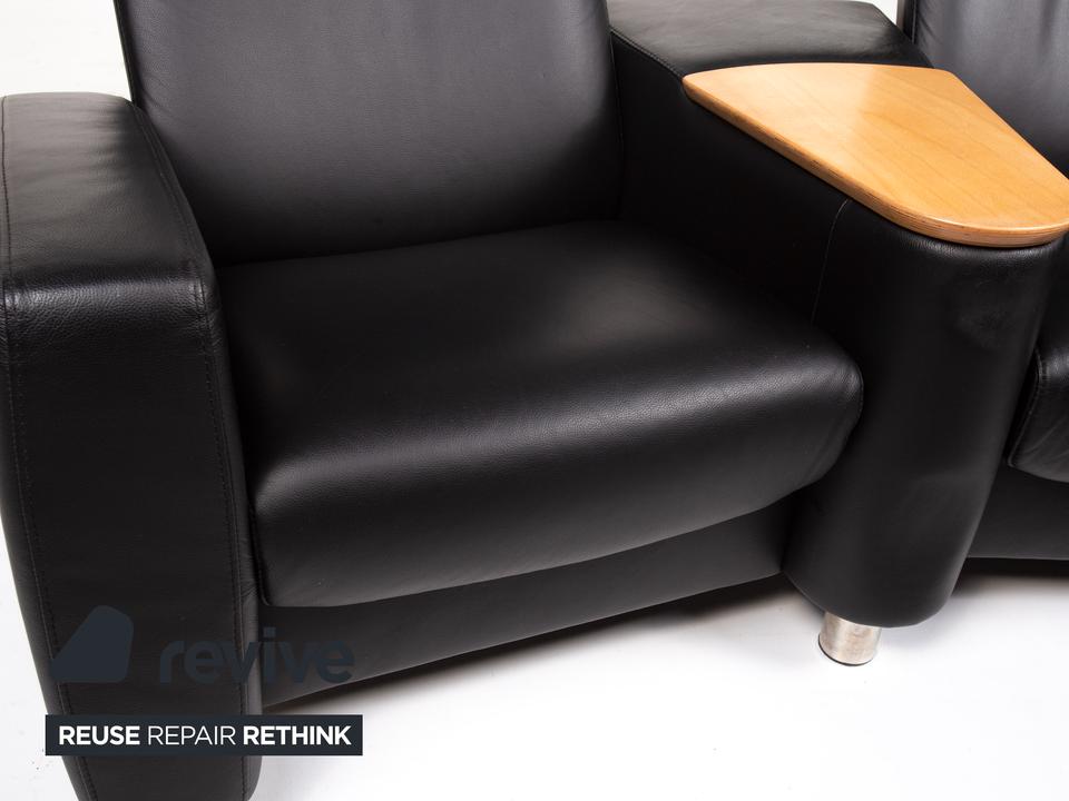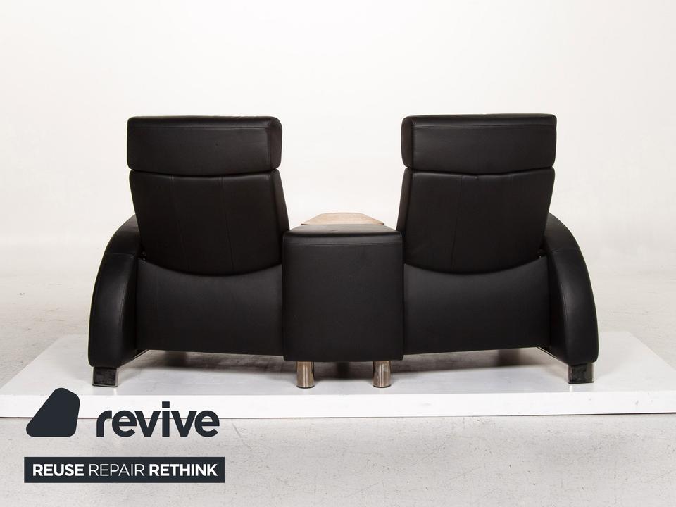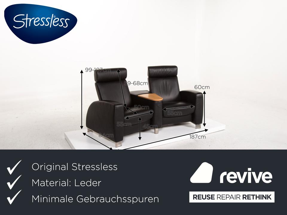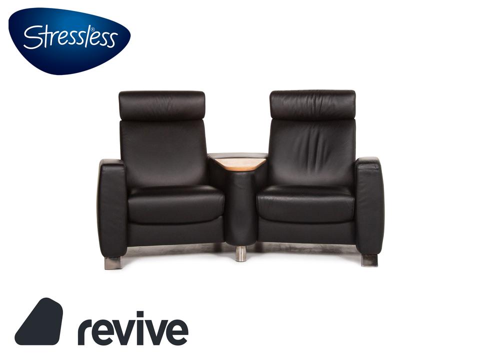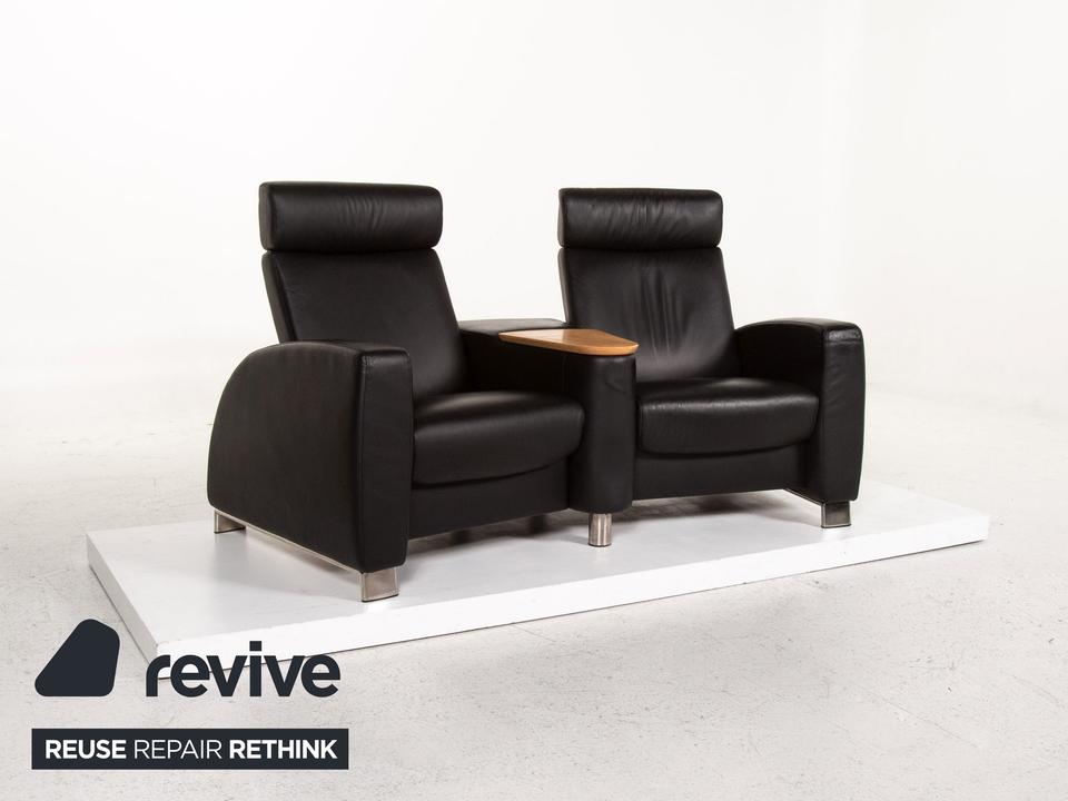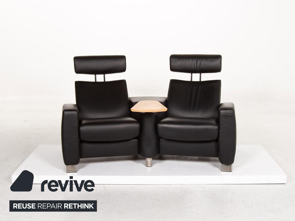 Der Arion Zweisitzer von Stressless ist mit einem schwarzen Echtleder bezogen und komplett mit diesem ummantelt. Eine Ablagefläche in der Mitte sowie Stauraum darunter sind zusätzliche komfortable Alltagshelfer. Die Kopfstützen können nach oben geschoben werden.