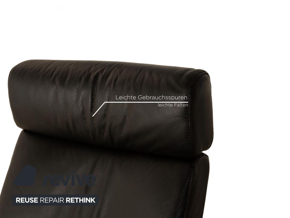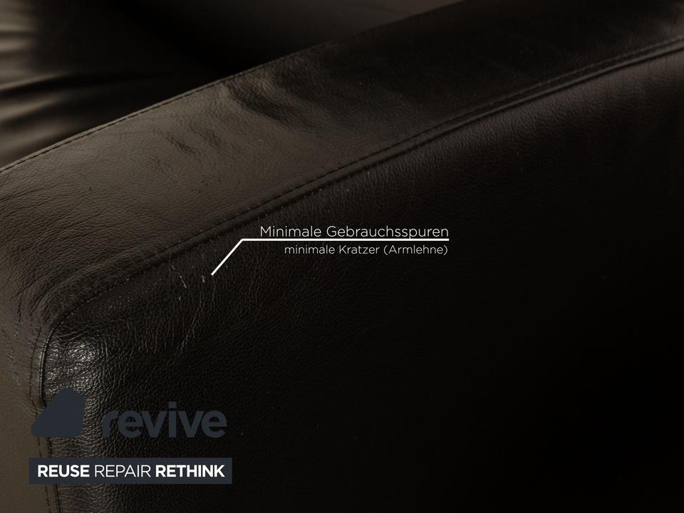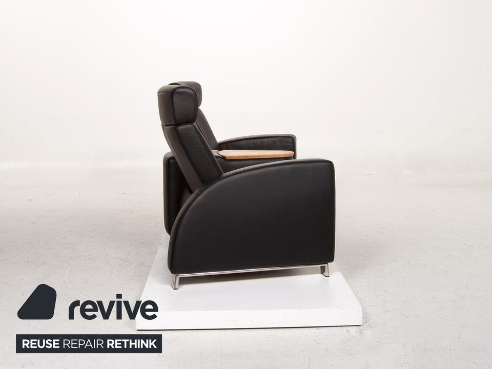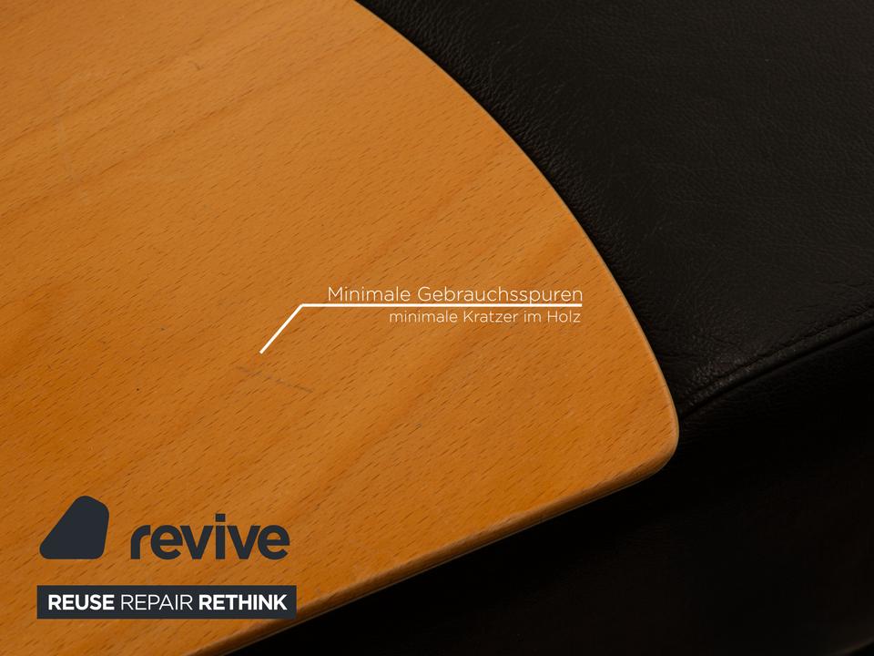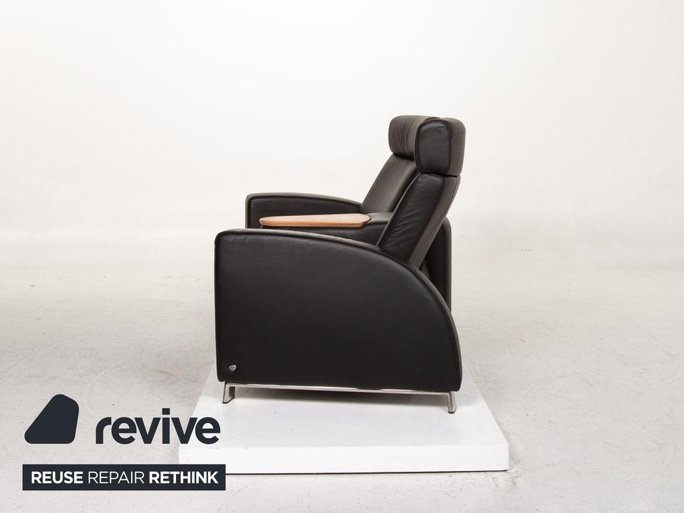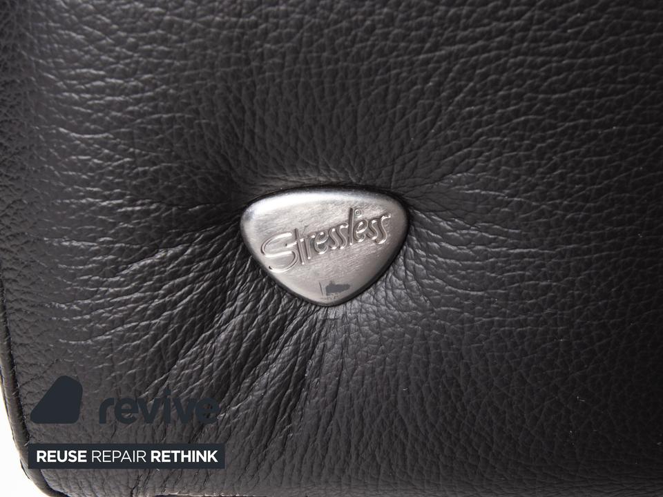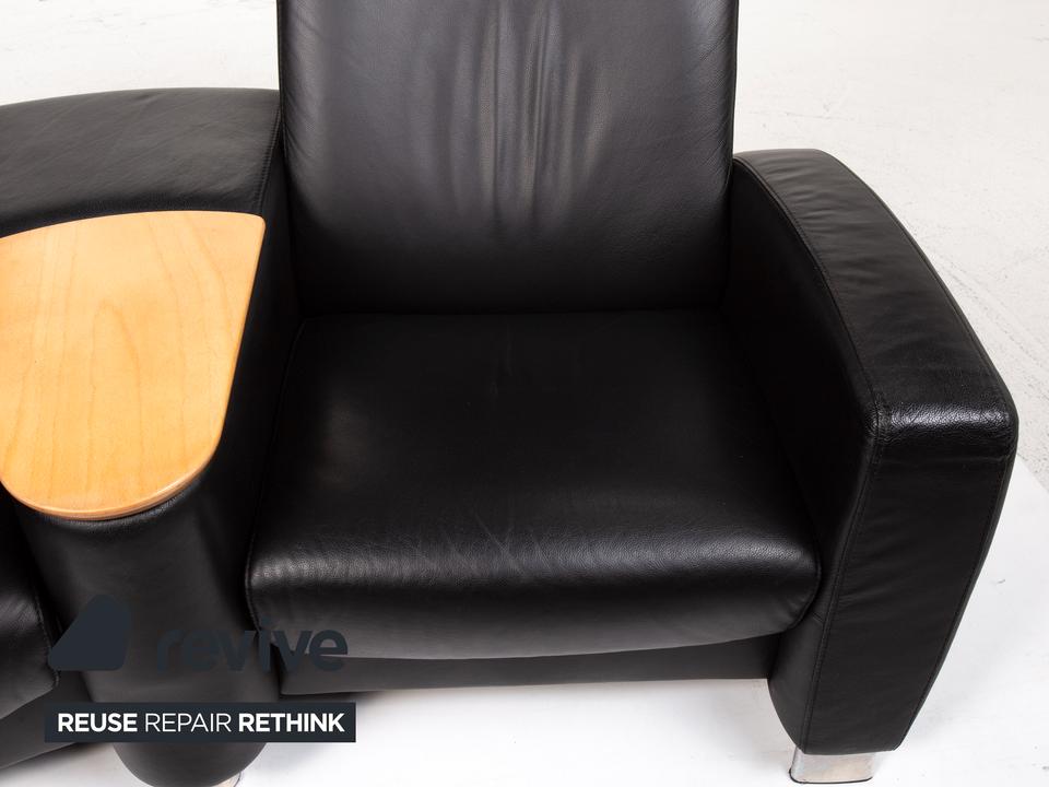 Der Arion Zweisitzer von Stressless ist mit einem schwarzen Echtleder bezogen und komplett mit diesem ummantelt. Eine Ablagefläche in der Mitte sowie Stauraum darunter sind zusätzliche komfortable Alltagshelfer. Die Kopfstützen können nach oben geschoben werden.